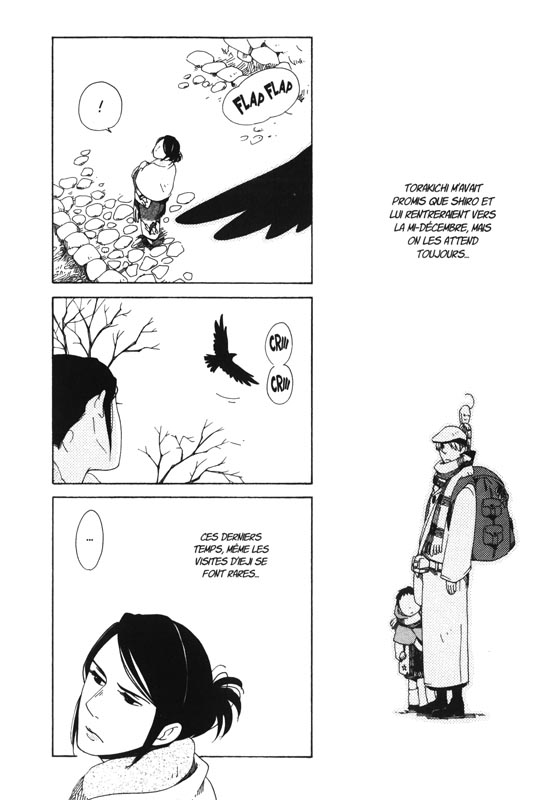 À force de se surmener en essayant de concilier son travail habituel et les soins à apporter à un jeune enfant, ce qui devait arriver arrive... Torakichi tombe gravement malade et s’écroule sur une route de forêt ! Heureusement, deux de ses collègues qui se trouvaient dans les parages parviennent à le soigner, mais l’épreuve est très difficile pour Shiro, effrayé à l’idée de perdre son papa.
