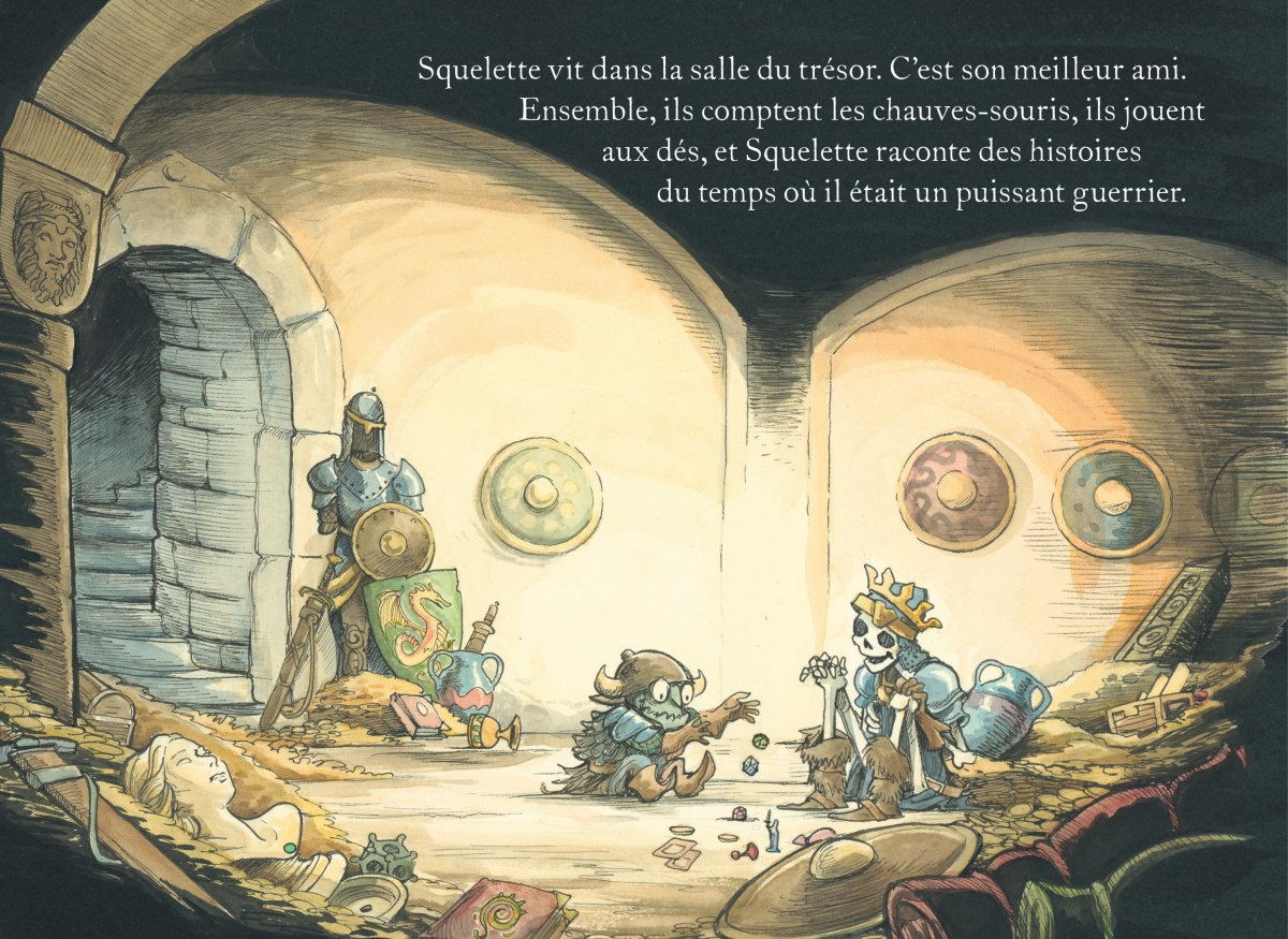 Un gentil petit gobelin vit dans le donjon d’un vieux château avec son meilleur ami, Squelette. Tous les jours, ils s’amusent dans la salle du trésor. Un jour, un groupe de « valeureux chevaliers » débarque, et c’est la débandade ! Ces malotrus saccagent le donjon, volent le trésor, mais surtout embarquent Squelette ! Le petit gobelin se retrouve tout seul. Osera-t-il affronter le monde pour sauver son meilleur ami ? Une très belle histoire sur la différence et l’amitié.