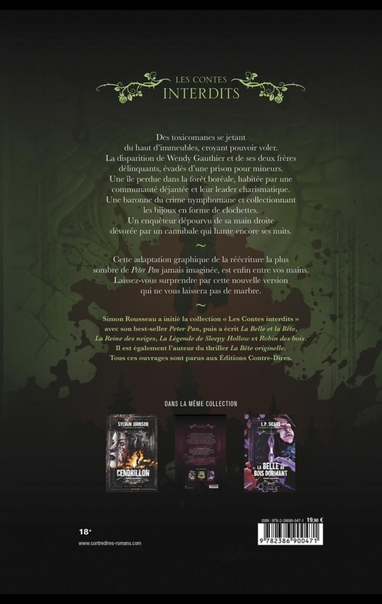 Peter Pan est un volume de la série Contes Interdits (Les) par Simon-Pierre Marion, Nolan Babin et Simon Rousseau, paru en 2025. Selon nos informations, il n'en existe qu'une seule édition, publiée par Contre-dires.