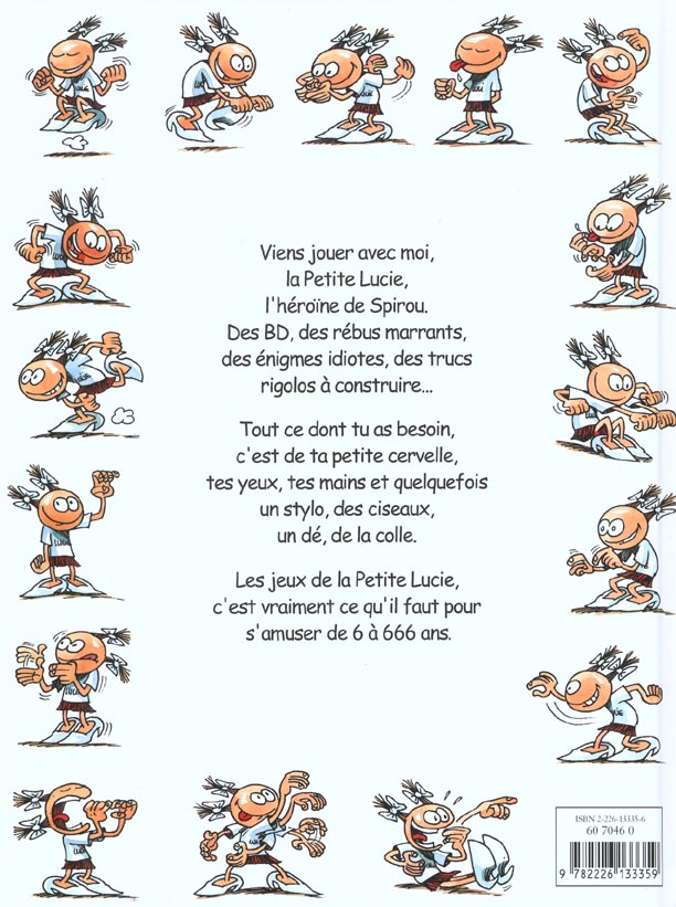 Viens jouer avec moi, la Petite Lucie, l’héroïne de Spirou. Des BD, des rébus marrants, des énigmes idiotes, des trucs rigolos à construire... Tout ce dont tu as besoin, c’ est de ta petite cervelle, tes yeux, tes mains et quelquefois un stylo, des ciseaux, un dé, de la colle. Les jeux de la Petite Lucie, c’est vraiment ce qu’il faut pour s’amuser de 6 à 666 ans.