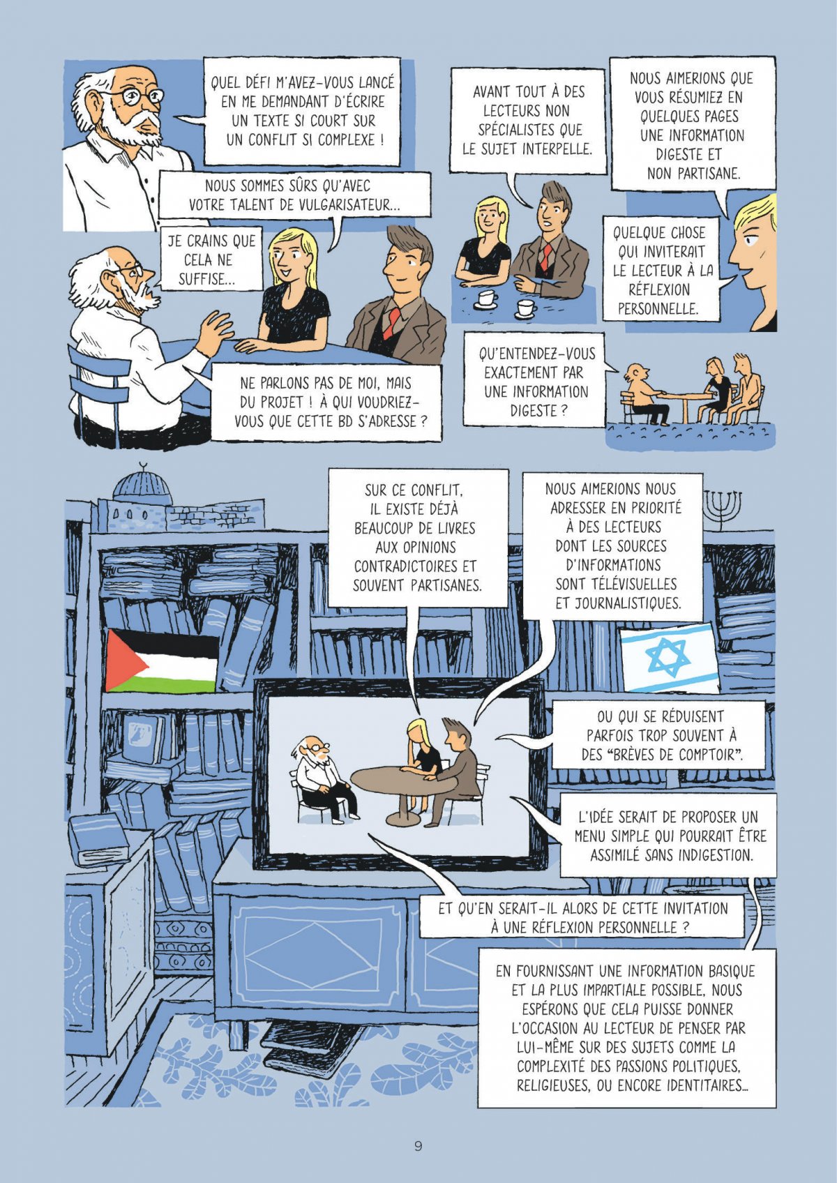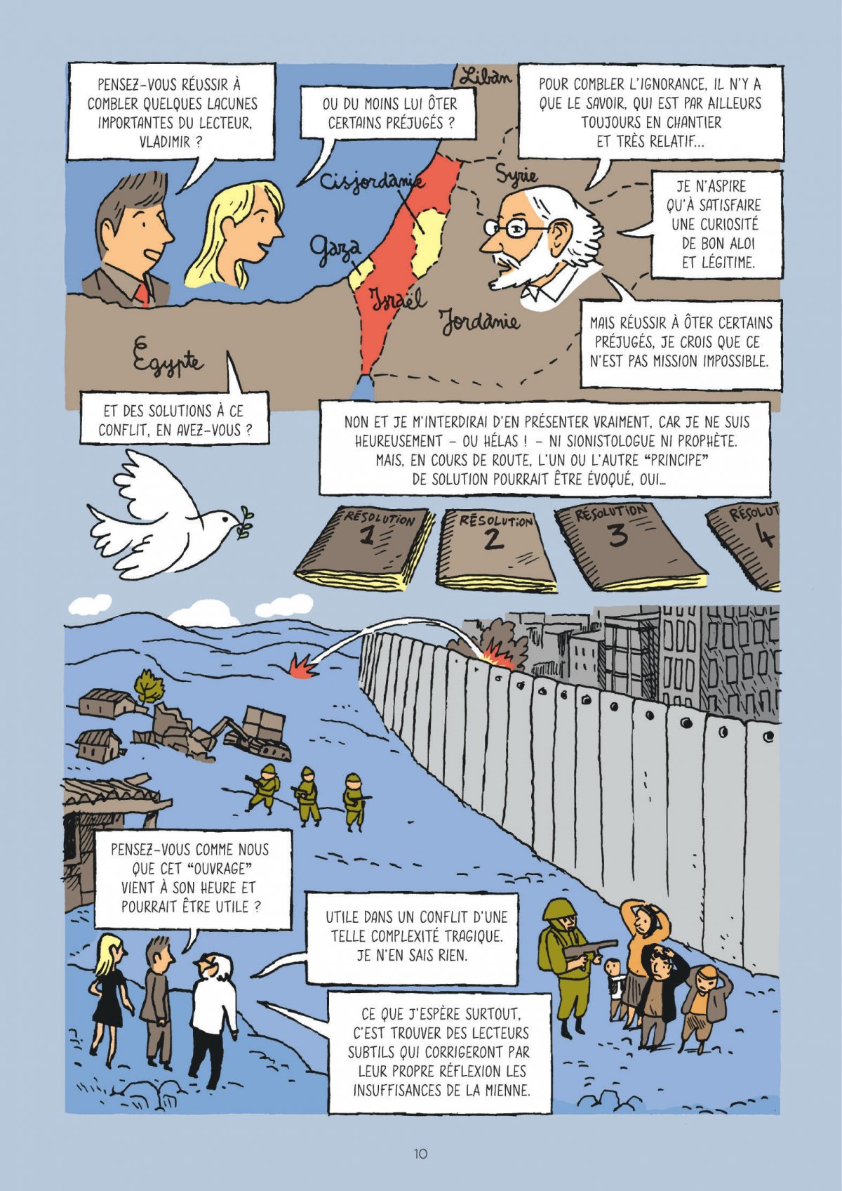 Le peuple judéo-israélien a réussi la restauration de son indépendance nationale qui met fin à deux mille ans d’exil, d’impuissance et à l’inimaginable Shoah (catastrophe en hébreu). Le peuple palestinien, autochtone, est entré dès le début en résistance devant la menace du sionisme politique. La Nakba (catastrophe en arabe) scella son destin et l’impossible retour en ses foyers. L’Histoire, toujours imprévisible et pour l’heure inachevée, prendra-t-elle enfin la voie de compromis raisonnables ? Cette bande dessinée met en lumière toute la complexité de la question.