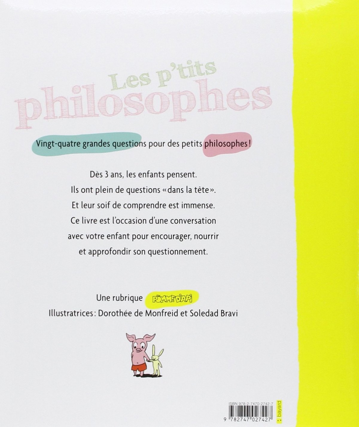 P’tits philosophes (Les) est le volume 1 de la série Petits philosophes (Les) par Sophie Furlaud, Dorothée de Monfreid et Soledad Bravi, paru en 2009. Selon nos informations, il n'en existe qu'une seule édition, publiée par Bayard / Bonne Presse.