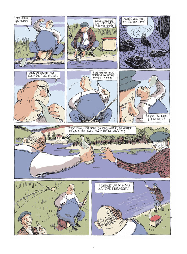 Chaque jour, Edmond et Pierre, deux petits vieux (ou deux « seniors », pourront dire les plus ancrés dans la modernité), s’installent au bord de la rivière pour pêcher. Ils font de temps à autre des pauses pour casser la graine ou boire un coup de blanc. Parfois ça mord un peu.Le temps s’écoule ainsi, au rythme des prises. Le soir, chacun rentre chez lui. Edmond retrouve son chat, et Pierre parle à la photo de sa femme décédée d’un cancer