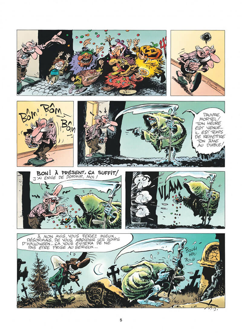 Contrairement aux idées reçues, fossoyeur n’est pas un boulot éternellement de tout repos. Entre les morts qui veulent figurer dans le livre des records, ceux qui hésitent toujours entre être incinérés, enterrés ou immergés, les maris trompés qui réclament vengeance et les réunions de copropriétaires du cimetière, Pierre Tombal a fort à faire. Alors quand arrive Halloween, notre héros est prêt à tout pour affronter des hordes de squelettes en fête.