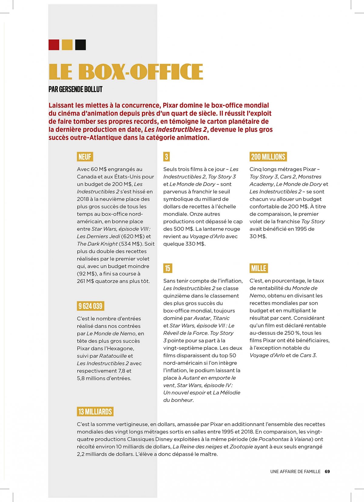 « TOUT LE MONDE NE PEUT PAS DEVENIR UN GRAND ARTISTE, MAIS UN GRAND ARTISTE PEUT SURGIR N’IMPORTE OÙ. » (Anton Ego in Ratatouille) Le temps qui passe, l’entraide, l’apprentissage de l’humilité, l’émancipation, l’affirmation de soi, le sens de la famille, le respect des traditions, l’avenir de la civilisation... Développées à tour de rôle dans Toy Story, 1001 Pattes, Cars, Wall-E, Rebelle, Vice-Versa et Coco, ces thématiques servent de fil conducteur à la filmographie des ingénieux studios Pixar, d’une cohérence et d’une modernité sans cesse réaffirmées depuis plus de trois décennies. Éclairé de portraits et d’entretiens avec les artistes phares de la société à la lampe bondissante, de multiples zooms ludiques, économiques ou analytiques, et d’illustrations inédites d’artistes immanquablement influencés par l’insolente créativité des surdoués des studios d’Emeryville, ce mook revient sur les vingt longs métrages fondateurs ainsi que la ribambelle de courts qui, de Luxo Jr. à Bao, ont favorisé l’émergence de nouveaux talents.