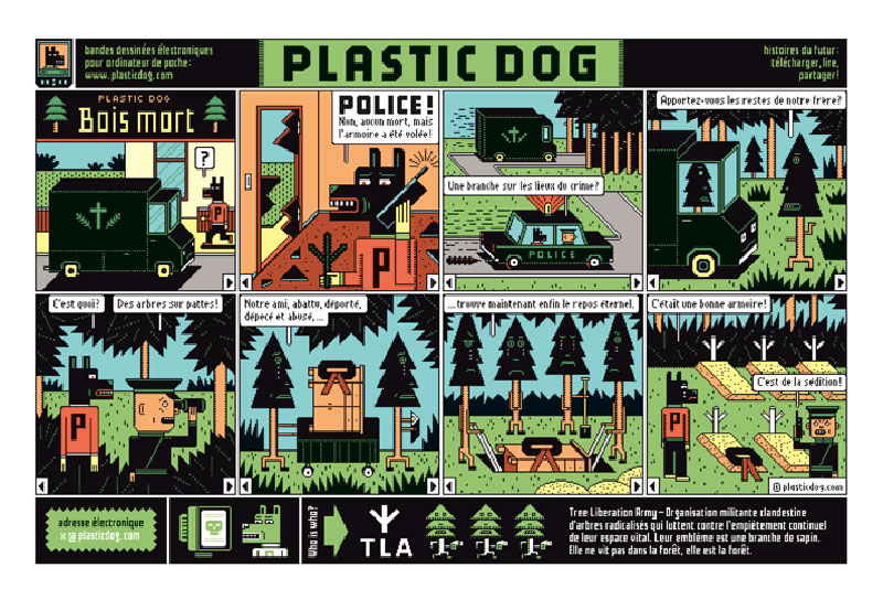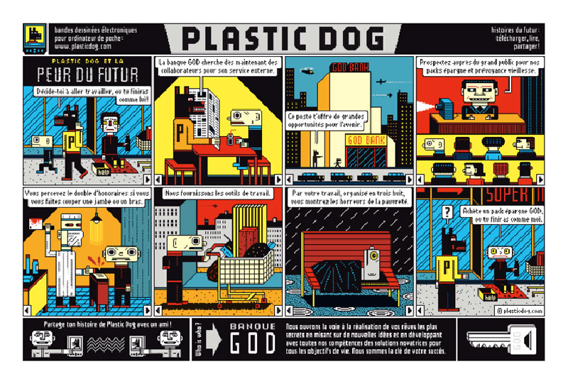 Il était temps de rendre enfin disponible Plastic Dog, bande dessinée du pionnier allemand de la bande dessinée sur ordinateur, Henning Wagenbreth. Graphiste ta-lentueux et reconnu, Wagenbreth avait à l’origine conçu cette oeuvre pour les premiers ordinateurs de poche (Pocket PC, Palm OS), en véritable précurseur de cette bande dessinée numérique encore balbutiante aujourd’hui. Les aventures de Plastic Dog avaient ensuite été publiées dans le quotidien allemand Die Zeit, qui diffusait en parallèle une version numérique via leur site. Cette première édition en livre cartonné donne enfin un écrin à la mesure de sa réussite. Plastic Dog, créature à la fois humaine, canine et plastique, vit des aventures étranges avec robots et jeux vidéos meurtriers dans un futur de science-fiction et dans un au-delà cauchemardesque. Les pixels et l’humour caustique d’Henning Wagen-breth peignent, en 26 planches somptueuses, des fables où la technologie sert avant tout à nous empêcher de sombrer dans la dépression, sans nous sauver du désastre environnemental et humain, bien au contraire.