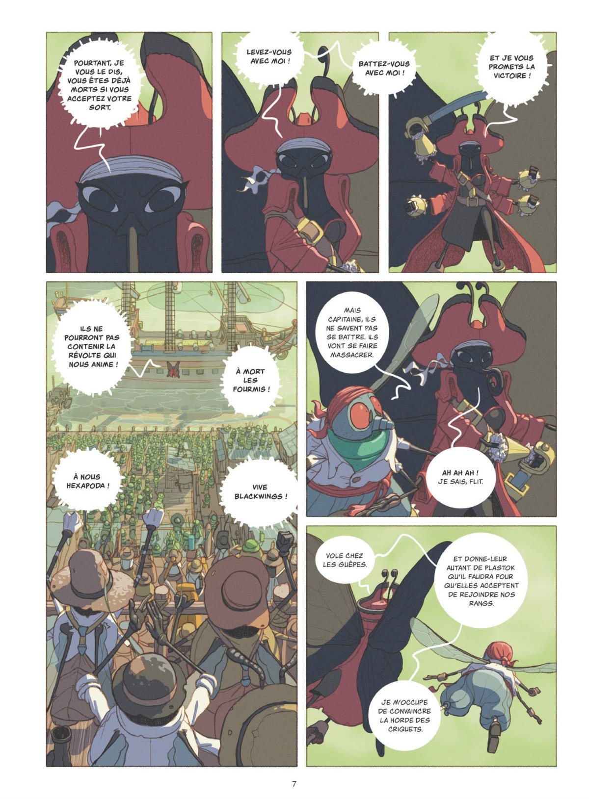 Mais depuis peu, la révolte gronde parmi tous ces insectes opprimés par les « justes » : les coccinelles, les abeilles et les fourmis. Les « nuisibles » ont désormais soif de liberté, une liberté revendiquée par Blackwings. La pirate veut marcher sur Hexapoda et aura besoin de renfort pour renverser le vieux monde. Maintenant qu’elle a trouvé le légendaire continent de Plastok, elle compte bien marchander ce trésor contre une armée de guêpes ou de criquets. Pendant que les esprits s’échauffent, en interne, une enquête plus approfondie sur la mort de la prêtresse est ouverte... Bug va-t-il enfin être innocenté ?