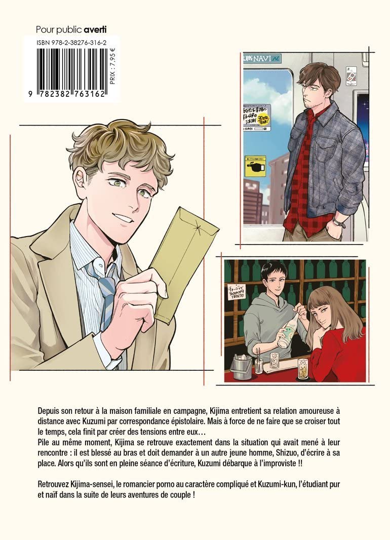 Depuis son retour à la maison familiale en campagne, Kijima entretient sa relation amoureuse à distance avec Kuzumi par correspondance épistolaire. Mais à force de ne faire que se croiser tout le temps, cela finit par créer des tensions entre eux...Pile au même moment, Kijima se retrouve exactement dans la situation qui avait mené à leur rencontre : il est blessé au bras et doit demander à un autre jeune homme, Shizuo, d’écrire à sa place. Alors qu’ils sont en pleine séance d’écriture, Kuzumi débarque à l’improviste !!Retrouvez Kijima-sensei, le romancier porno au caractère compliqué et Kuzumi-kun, l’étudiant pur et naïf dans la suite de leurs aventures de couple !
