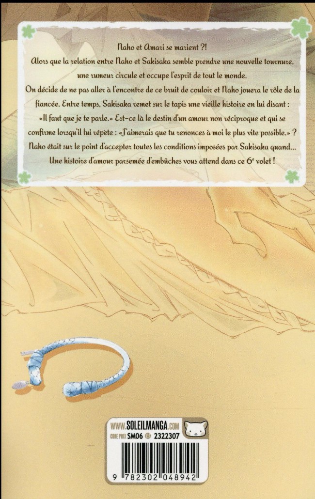 On décide de ne pas aller à l’encontre de ce bruit de couloir et Naho jouera le rôle de la fiancée. Entre temps, Sakisaka remet sur le tapis une vieille histoire en lui disant : « Il faut que je te parle. » Est-ce là le destin d’un amour non réciproque et qui se confirme lorsqu’il lui répète : « J’aimerais que tu renonces à moi le plus vite possible. » ? Naho était sur le point d’accepter toutes les conditions imposées par Sakisaka quand... Une histoire d’amour parsemée d’embûches vous attend dans ce 6e volet !