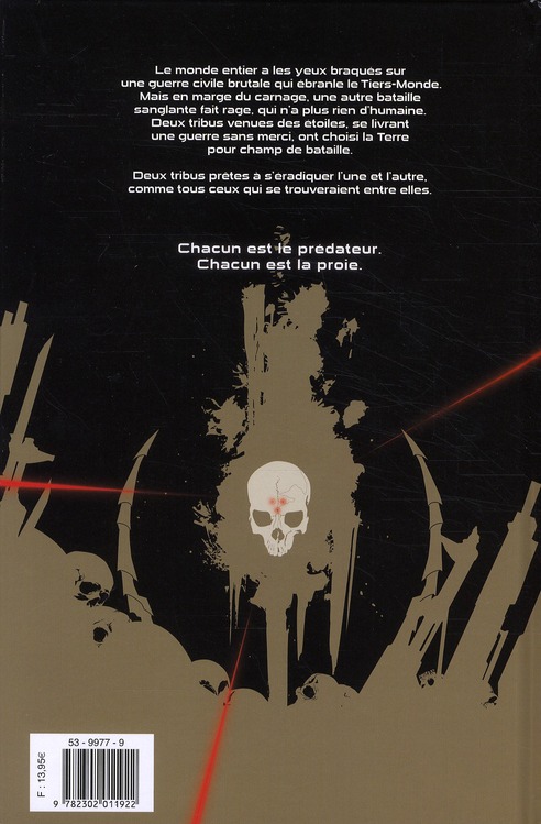 Le monde a les yeux braqués sur une guerre civile brutale qui se déroule dans le tiers-monde. Un conflit impitoyable n’épargnant ni les soldats, ni les civils. Mais, au milieu de la terreur et du carnage, là où les grandes nations luttent pour prendre l’avantage, une autre bataille sanglante fait rage dans l’ombre. Deux tribus venues des étoiles se font la guerre et ont choisi la Terre comme champ de la bataille. Chacun est la proie des autres, chacun est le prédateur de l’autre !