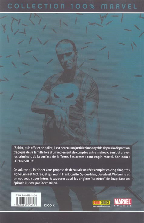 Ce volume du Punisher vous propose de découvrir un récit complet en cinq chapitres signé Ennis et McCrea, et qui réunit Frank Castle, Spider-Man, Daredevil, Wolverine et un nouveau super-héros. A savourer aussi les origines "secrètes" de Soap dans un épisode illustré par Steve Dillon.