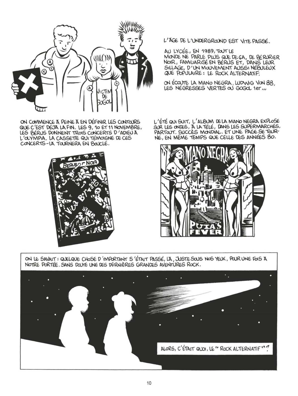 Mais cette histoire se distingue des autres aventures purement musicales parce que cette scène fut aussi le précis témoin de son époque, de ses turbulences politiques et sociétales. Née avec l’élection de François Mitterand et achevée la même année que la chute du mur de Berlin, elle épouse l’histoire sociale et politique de la décennie, de l’arrivée de la gauche au pouvoir au tournant de la rigueur, de la cohabitation et des années Pasqua à la création des Restos du coeur, de la marche des Beurs de 1983 au score du Front National aux Européennes de 84, des attentats d’Action Directe à la mort de Malik Oussekine. Chaque événement impacte l’histoire du rock alternatif et conditionne la suite de son odyssée. Dans ce contexte, l’explosion de la popularité du groupe Bérurier Noir, qui est un des ressorts puissants du mouvement, est de première importance : ses disques se vendent par dizaines de milliers, se passent sous le manteau dans les lycées et dans les collèges : c’est un véritable phénomène sociologique, emblématique des tensions et des aspirations de la jeunesse de l’époque. Un groupe politisé, qui politise son public. En guise d’adieu, le groupe, miné par les contradictions internes liées au succès, à la pression médiatique et policière, remplit trois soirs de suite l’Olympia, et une foule de jeunes scande et chante, le majeur levé : "La jeunesse emmerde le Front national". La dissolution des Bérus marque un échec ou la fin d’un rêve, au moment où la Mano Negra, autre groupe emblématique, signe son deuxième album sur Virgin, signant symboliquement l’arrêt de mort d’une certaine innocence, d’une certaine utopie, d’une certaine époque, et d’une certaine jeunesse.