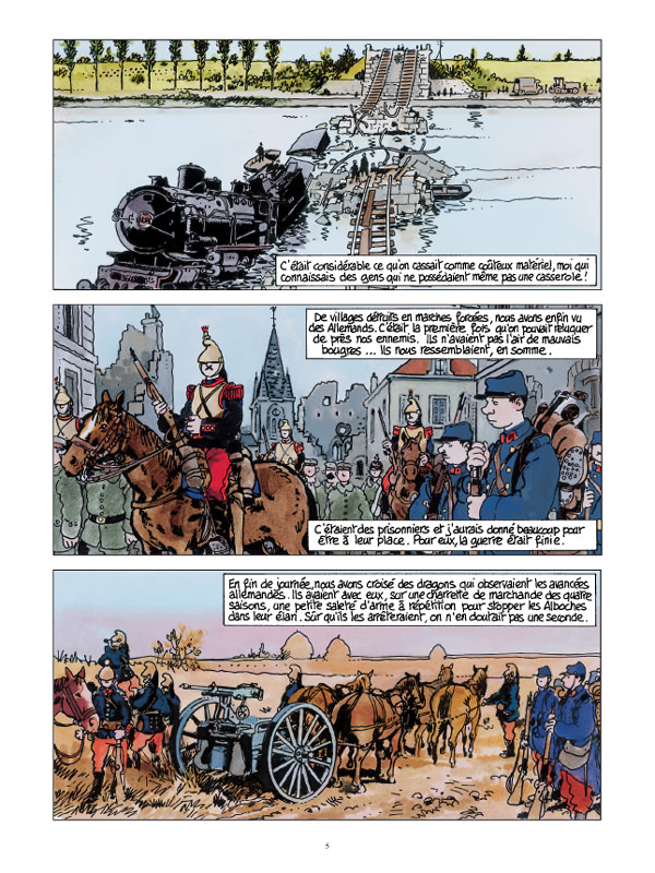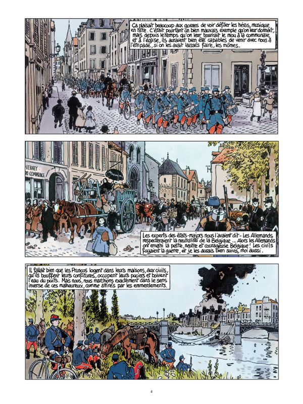 En cette année de commémoration du 90e anniversaire de la fin de la Grande Guerre, et alors que le dernier poilu vient de disparaître, Tardi renoue avec la mémoire de 14-18 à travers son nouveau projet : une évocation en bande dessinée du premier conflit mondial, et de la place qu’y ont occupée, au quotidien, les hommes qui s’y sont affrontés et entretués. Un récit de fiction, mais où le souci de véracité et la rigueur de la reconstitution historique occupent une place primordiale. Ce nouveau projet, dans la forme, reprend le découpage en 3 strips par page déjà utilisé dans l’album. C’était la guerre des tranchées. Le récit débute en couleurs, mais, au fil de sa progression chronologique, et à mesure que la guerre s’enkyste, s’étend et s’approfondit, adopte les tonalités de plus en plus monochromes de la boue et de la grisaille. Avant d’être proposé en librairie en album, fin octobre, ce nouveau grand récit de Tardi fait l’objet d’une publication sous la forme d’un journal grand format, à raison de trois numéros de vingt pages chacun. Chaque numéro du journal, centré par ordre chronologique sur l’une des années de la période 1914-1916, comporte d’une part quinze pages de bande dessinée et d’autre part cinq pages de textes et d’articles, consacrés à l’actualité non-militaire de la période. L’ensemble de ces textes, illustrés par Tardi, est signé de l’historien Jean-Pierre Verney, qui assure depuis des années, aux côtés du dessinateur, le travail de documentation.