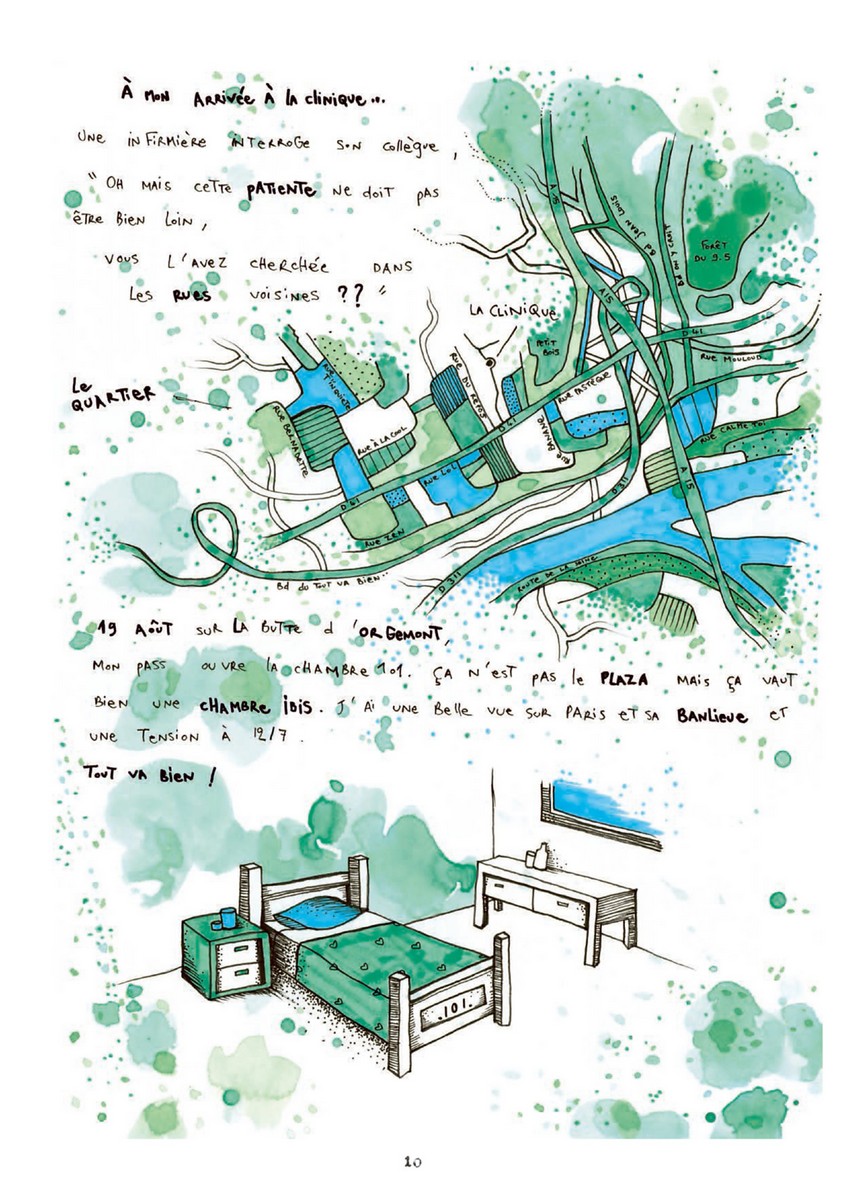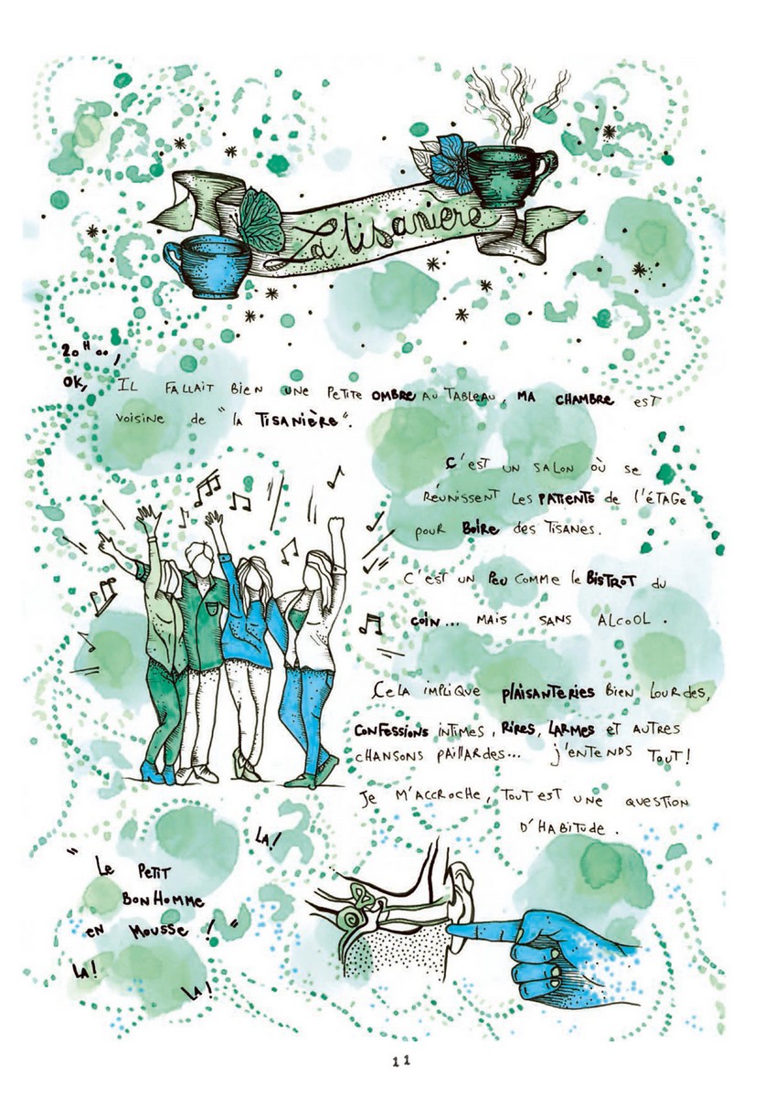 Le journal de bord acidulé d’une borderline qui raconte ses séjours en hôpital psychiatrique. Réalisé à l’aquarelle et aux feutres fluo : vert, orange et rose, Knl livre le quotidien de ses séjours. Elle a résolument choisi l’humour pour décrire ses hauts et ses bas, l’absurdité des situations à l’hôpital, les curiosités culinaires des plateaux repas, les jeux, l’ennui, les rêves, le mal-être et les récidives