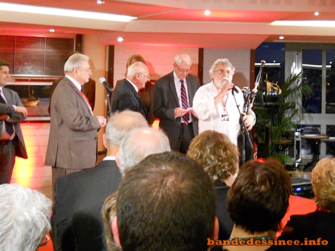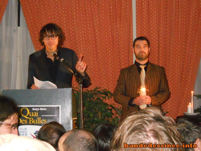 (7) Fabien Vehlman (à gauche) et Gwen De Bonneval (à droite sur la photo), en maîtres de cérémonie lors de la remise des Prix du festival