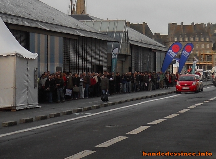 A quelques minutes de l’ouverture du trente-troisième Quai des Bulles pour son édition 2013, les festivaliers matinaux sont déjà nombreux à se masser devant le Quai St Malo, naguère nommé espace Duguay-Trouin. L’ambiance était pourtant très bon enfant, le grand nombre d’auteurs attendus (près de cinq cent, nous a-t-on dit) permettra de toutes manières de repartir avec quelques-unes des précieuses dédicaces qui font venir parfois de très loin les amateurs de bande dessinée.