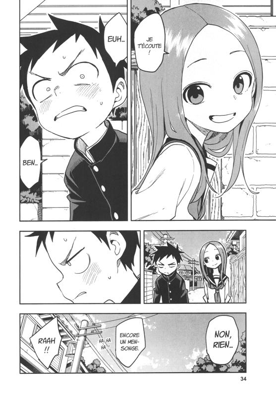 L’évaluation en cours de musique approche et Nishikata n’est pas très à l’aise avec le chant. Souhaitant faire quelques répétitions avant le jour-j, il a demandé à Takagi de le rejoindre derrière la classe, loin des regards, mais il a oublié d’en donner la raison ! oserait-elle en profiter et installer une situation embarrassante pour Nishikita ? bien sûr !!