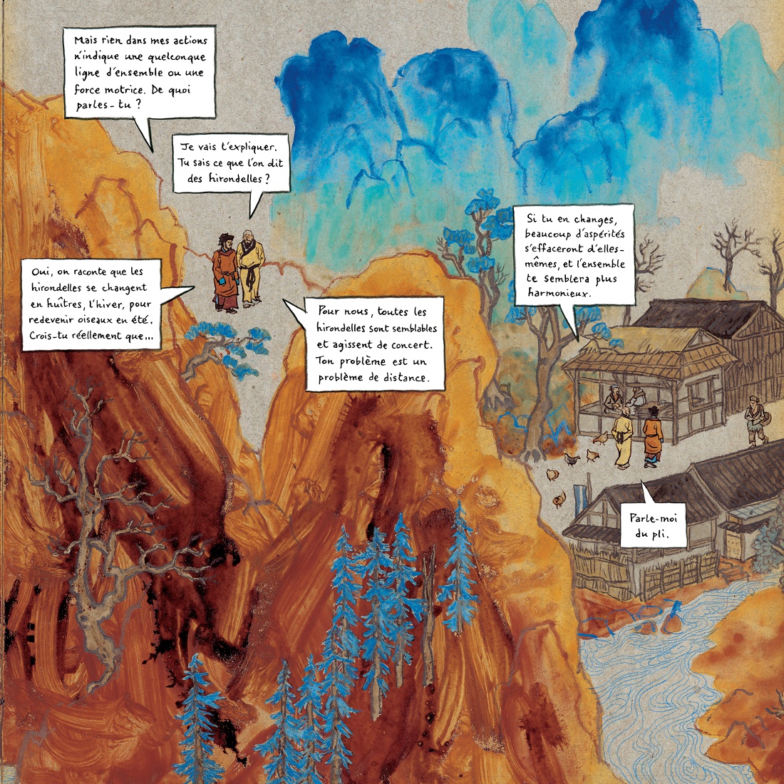 Hommage aux rouleaux traditionnels chinois, ce livre-accordéon déploie en perspective cavalière les pérégrinations philosophiques du sage Song Jiang prodiguant ses conseils à quatre camarades, chacun originaire d’un point cardinal. Huit cartes inspirées des trigrammes taoïstes complètent ce livre-objet qui essaie de jeter un pont, à contre-temps, entre la peinture ancienne et les jeux d’arcade.