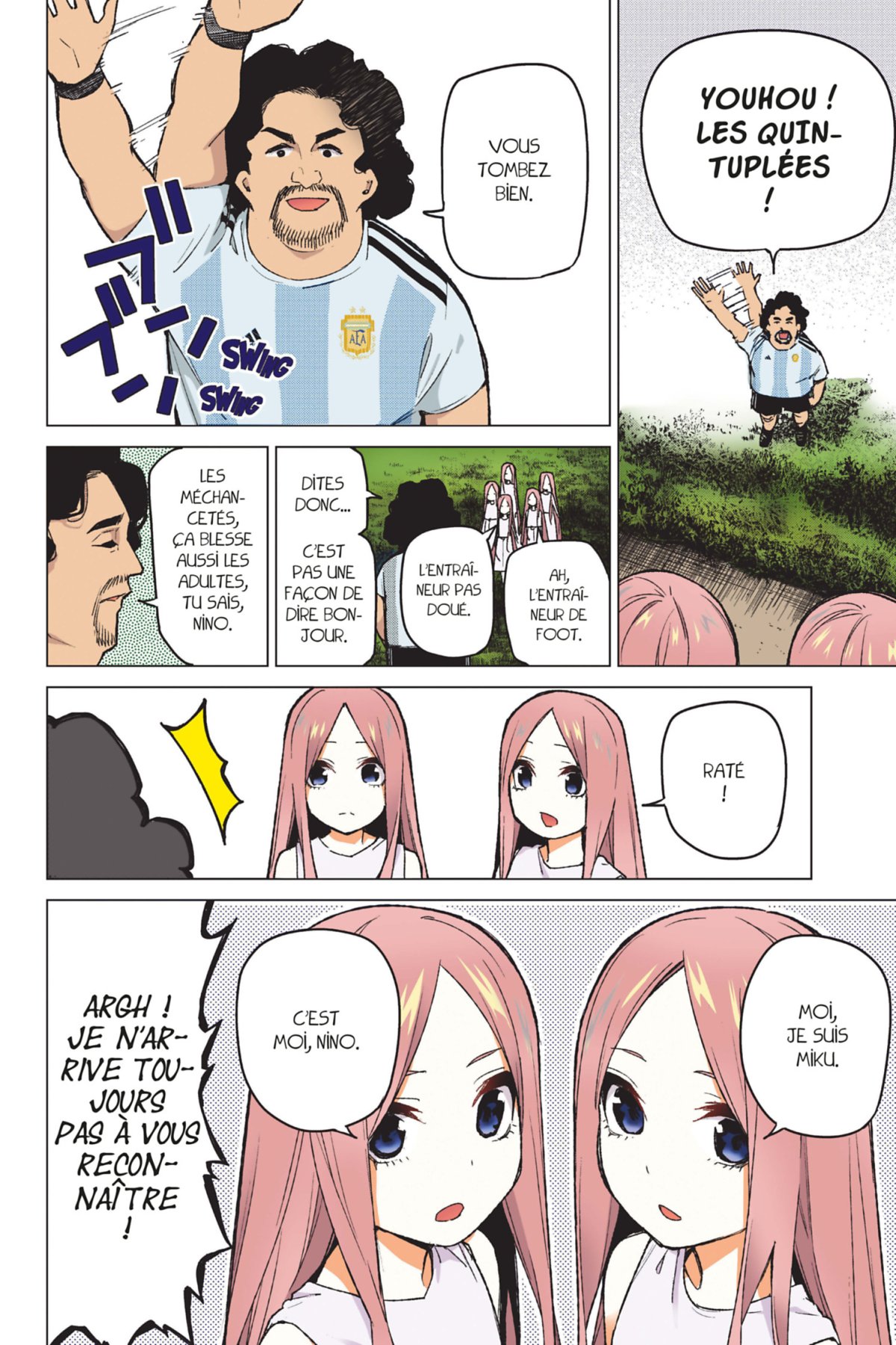 Bien malgré lui, Fûtarô fait battre le coeur des soeurs Nakano. Et si les cinq soeurs usent de stratagèmes plus ou moins retors pour obtenir les faveurs de leur professeur particulier, au final, le lien qui les unit est bien plus fort que leur rivalité amoureuse. Un voyage dans le passé lève un voile sur les racines de ces liens et sur la véritable identité de la petite fille rencontrée à Kyoto,il y a six ans.