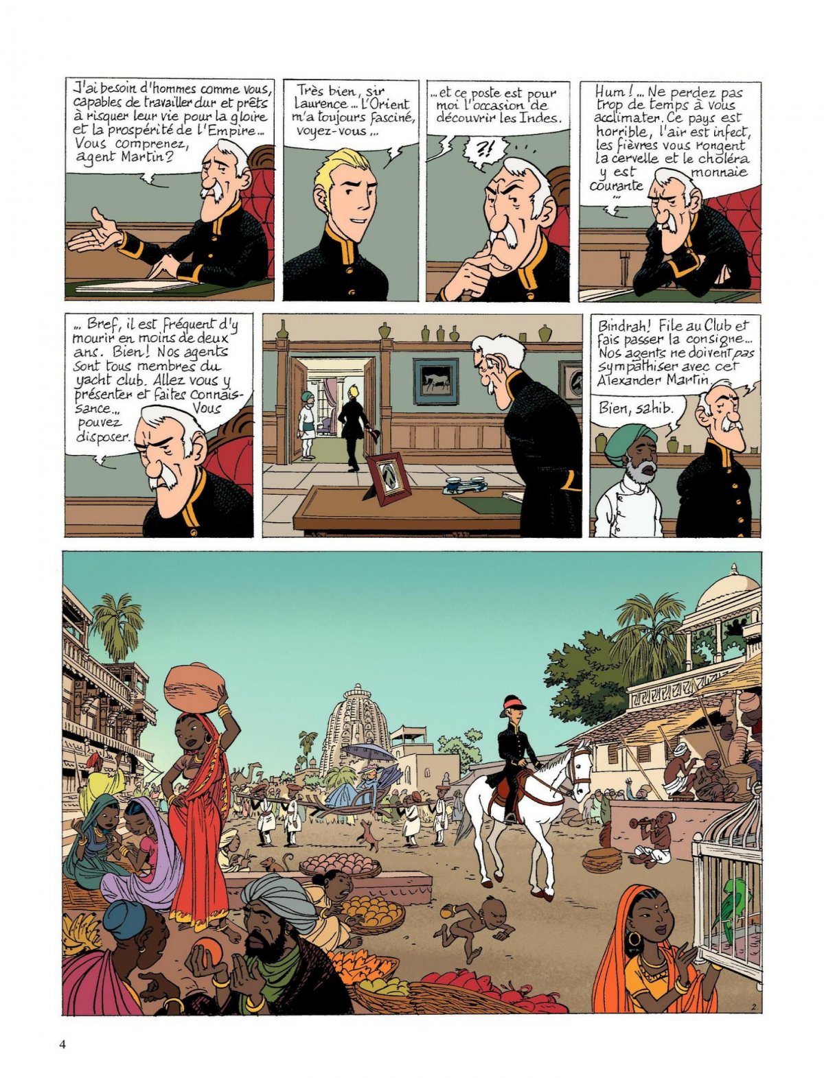 1831. Parti de Londres, Alexander Martin débarque à Bombay pour y rejoindre l’Indian Political Service (I.P.S.) dont le rôle est d’aider l’Honorable Compagnie des Indes à développer ses affaires... C’est-à-dire d’empêcher les autres états d’Europe de s’installer sur le continent indien dominé par les Britanniques. L’arrivée du nouvel agent ne semble guère enchanter ceux qui sont en place depuis longtemps et dont le souci principal est d’augmenter leur fortune personnelle en spoliant et asservissant les indigènes. Alexander s’y fait cependant quelques relations. Guidé par le journaliste David Baltimore, il découvre les étranges croyances locales. Intrigué par la présence d’un Européen au milieu d’un groupe d’Hindous pratiquant leurs rituels, le journaliste le suit afin de l’identifier. Alexander le retrouve quelques instants après, agonisant sous l’effet de la morsure d’un cobra... Mais voici que malgré la gravité de son état, David Baltimore disparaît. D’autres mystérieuses disparitions surviennent ensuite dans la communauté d’expatriés anglais ! Pressé de régler ce problème, l’I.P.S. décide d’accuser aussitôt un concurrent de l’Honorable Compagnie des Indes. Le capitaine de la Compagnie portugaise Sao Mateo fera un coupable idéal. C’est toutefois compter sans l’honnêteté de l’agent Alexander Martin qui répugne à faire arrêter un innocent...