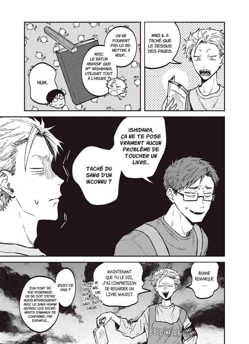 Ishidaira, petite frappe de lycée qui n’avait pas remis les pieds dans une bibliothèque depuis l’école primaire travaille désormais comme bibliothécaire en temps partiel. Dans ce tome, il fera face à pas mal de déboires : il découvrira les différences de traitements entre les employés permanents les contractuels, et n’arrivera pas à réfréner sa colère devant un usager qui a abîmé un livre.