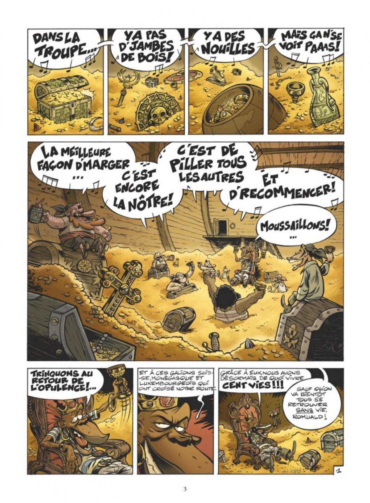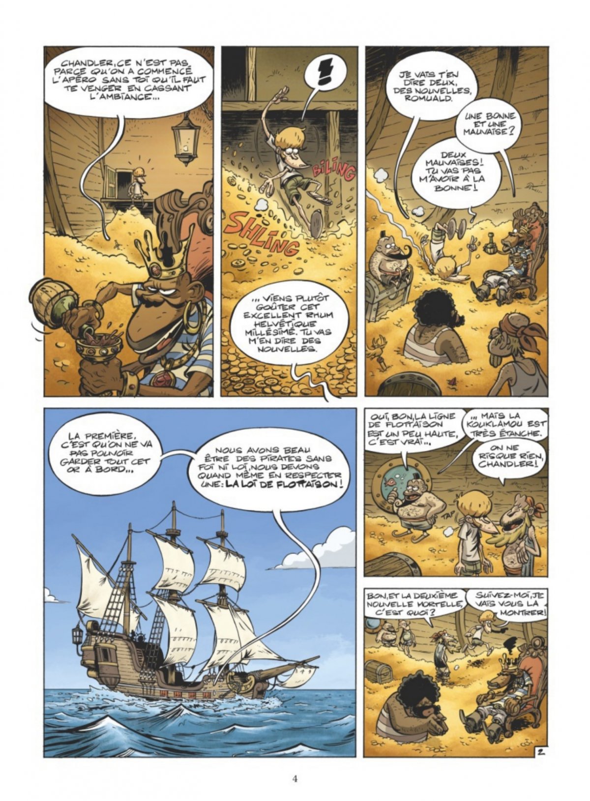 Il était temps, l’équipage de la Kouklamou a enfin mis la main sur un trésor ! Mais soumis au poids de tout cet or, le navire ne tarde pas à passer en dessous de la ligne de flottaison et à prendre l’eau... saccageant ainsi tous les livres de la bibliothèque du Capitaine ! Le problème, c’est que l’un d’entre eux, Consolation, a été emprunté à un navire-bibliothèque à la politique très stricte : « saisie totale des biens de l’emprunteur en cas de non-retour du livre » ! Le Capitaine, Romuald et tous les autres n’ont d’autre choix que de partir en quête de l’ouvrage en question s’ils ne veulent pas perdre leur magot si durement acquis. Pas gagné alors que la crise du livre fait rage et que les librairies ferment toutes les unes après les autres...Les jeux de mots potaches et les situations absurdes reviennent de plus belle dans cette nouvelle aventure du plus barré des équipages de pirates, mené par les talentueux matelots Pilet et Pothier !