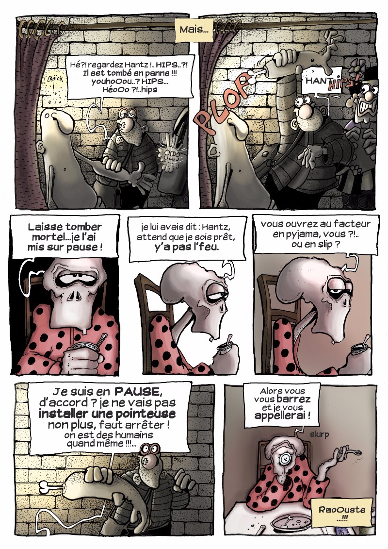 C’est par une sinistre nuit d’automne qu’un duo improbable se balade dans un cimetière à la rencontre de la faucheuse. Mais, cette dernière, n’est pas dans son meilleur jour. Et ce n’est certainement pas son équipe de bras cassés, une armée de zombies et quelques nains qui vont améliorer son quotidien. Un voyage à travers ces quatre planches va confronter la nonchalance du dessinateur à une faucheuse remontée. On ne plaisante pas avec la mort.