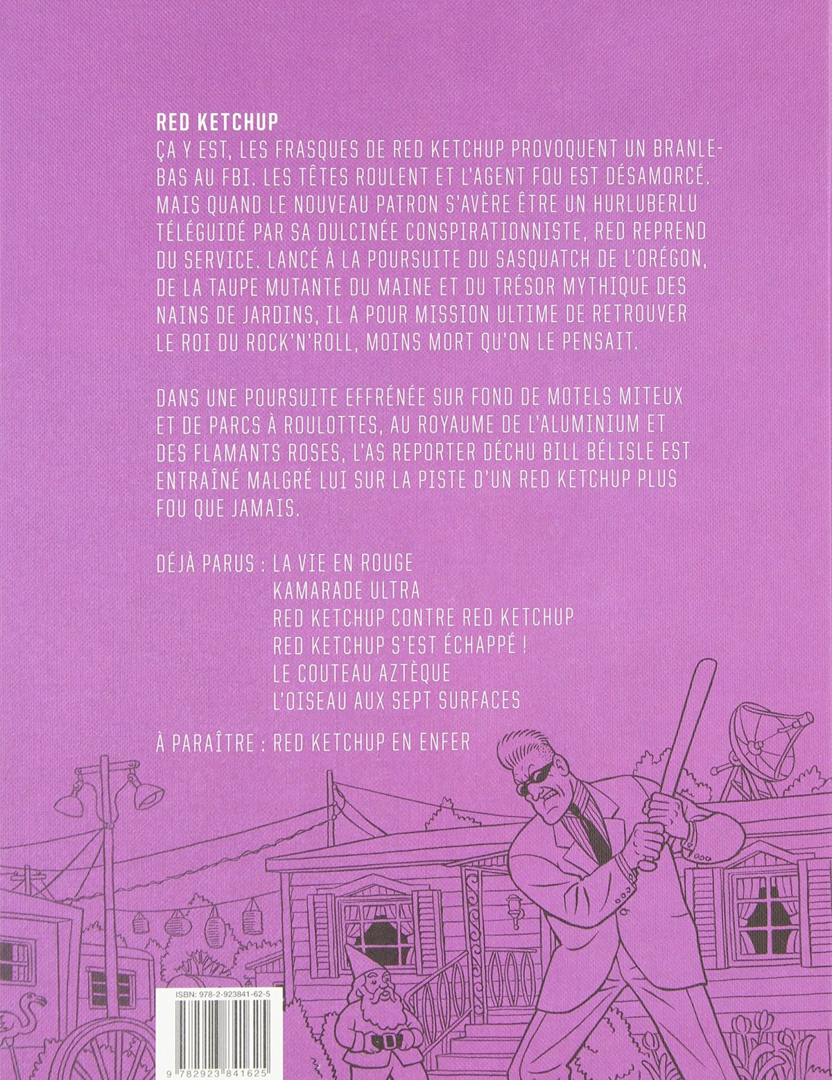 Ca y est, les frasques de Red Ketchup provoquent un branle-bas au FBI. Les têtes roulent et l’agent fou est désamorcé. Mais quand le nouveau patron s’avère être un hurluberlu téléguide par sa dulcinée conspirationniste, Red reprend du service. Lancé à la poursuite du sasquatch de l’Oregon, de la taupe mutante du Maine et du trésor mythique des nains de jardins, il a pour mission ultime de retrouver le roi du rock’n’roll, moins mort qu’on le pensait. Dans une poursuite effrénée sur fond de motels miteux et de parcs a roulottes, au royaume de l’aluminium et des flamants roses, l’as reporter déchu Bill Belisle est entraîne malgré lui sur la piste d’un Red Ketchup plus fou que jamais.