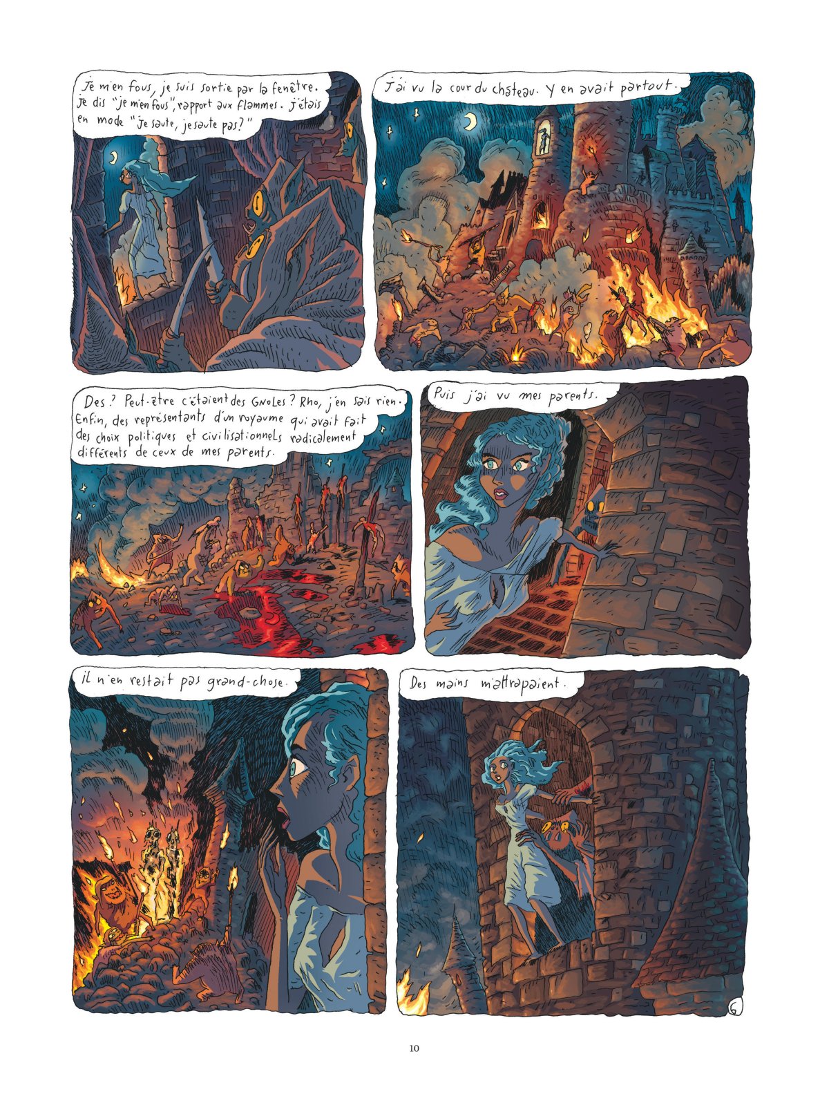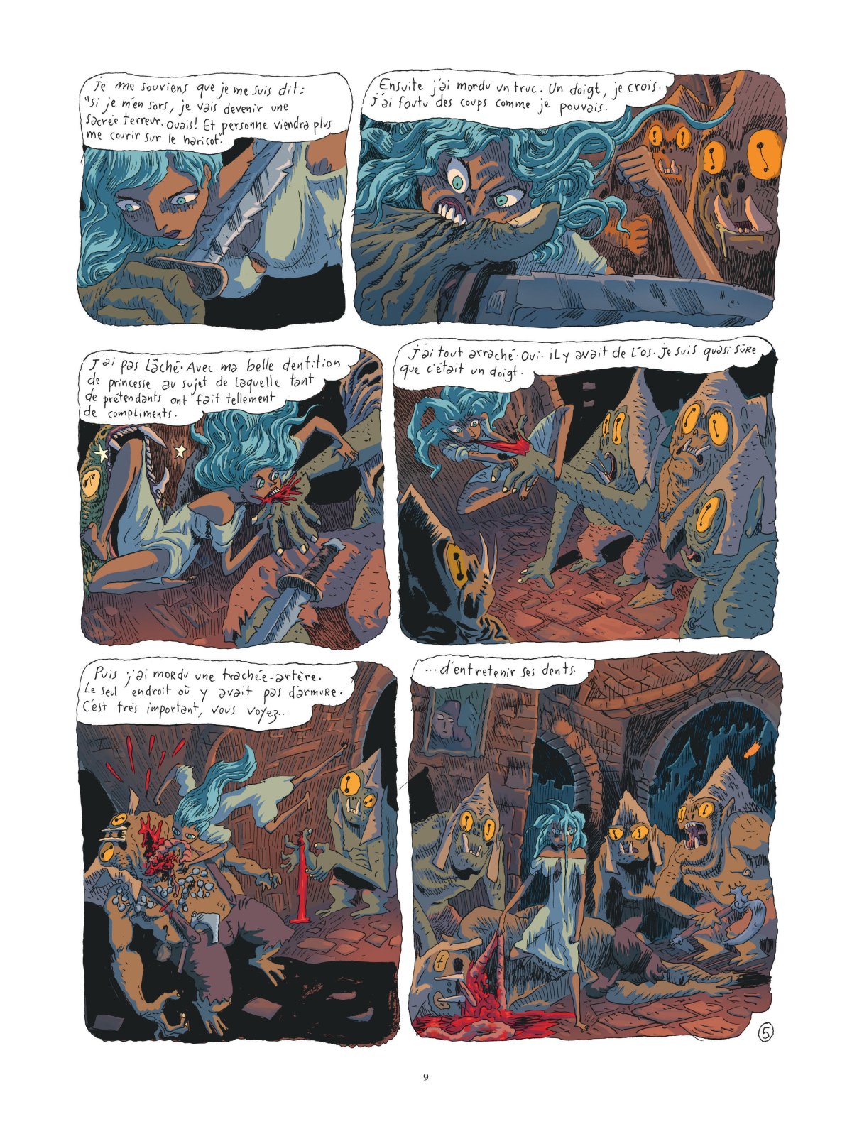 Notre jeune princesse est donc réveillée en pleine nuit par des feux grégeois et un semi-orque avec un micropénis penché au-dessus de son lit qui cherche à la bouffer et pire. Heureusement, forte dans pas mal de domaines dont les arts martiaux et la capoeïra, elle parvient à s’échapper de sa chambre. Près des restes calcinés de ses parents, elle croise, par chance, le magicien du palais qui parvient à l’aider à s’enfuir du château envahi. Juste avant de mourir, il lui offrit un objet exceptionnel sorti du fin fond de son labo bordélique et poussiéreux : une « bicyclette ». Accompagnée de ce truc qui roule, sonne et éclaire dont elle ne sait rien, notre héroïne quitte le château détruit pour survivre et poursuivre sa route... Une route qui, bien entendu et malheureusement, pour une jeune fille seule, sera tout aussi dangereuse.