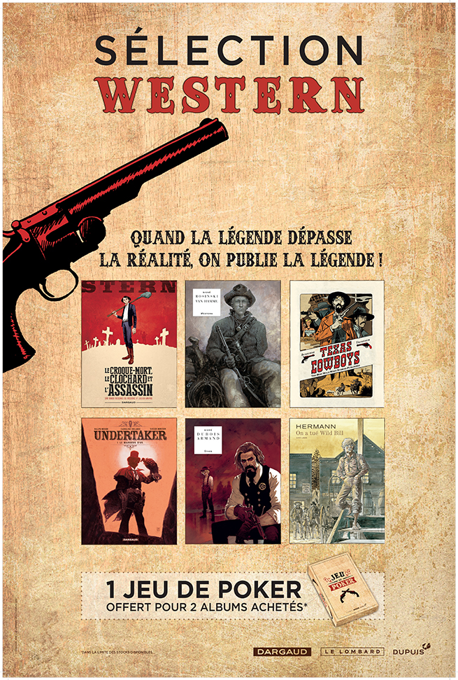 Pour cette rentrée, Dargaud, Dupuis et Le Lombard prennent la main et tablent sur un genre indémodable avec cette opération western plutôt engageante. A partir du 16 septembre, pour l’achat de deux albums de la sélection ci-dessous, votre libraire se fera un plaisir de vous offrir un jeu de poker illustré par les grandes figures issues de leur catalogue : Blueberry, Undertaker et Texas Cowboy sont notamment annoncés. De quoi faire sensation auprès de vos amis amateurs de bande dessinée et de poker.
