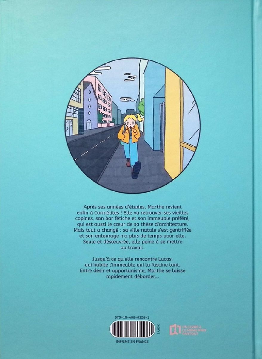 Marthe, 27 ans, revient s’installer chez sa mère à Carmélites, sa ville natale, pour écrire sa thèse. Son sujet d’études : un immeuble d’architecte qui l’a toujours intriguée et qui marque le début de la gentrification de son quartier. Nostalgique et déracinée par des années d’études hors de sa région, Marthe se réjouit de retrouver ses amies d’enfance qui elles, ne sont jamais parties. Mais elle se rend compte que les années et la distance ont creusé entre elles un gouffre qu’il est difficile d’enjamber. Désoeuvrée et au point mort dans ses recherches, elle se détourne de sa thèse et passe le plus clair de son temps à scroller sur les applications de rencontre. Tout semble se recouper lorsqu’elle croise le chemin de Lucas, jeune homme séduisant qui habite dans l’immeuble qui la fascine. Entre désir et opportunisme, l’obsession de Marthe devient vite dévorante...