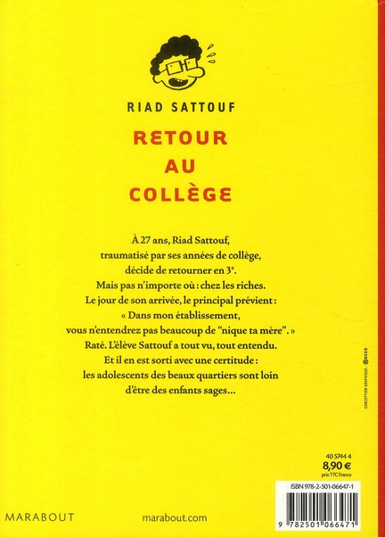 Riad Sattouf a passé 15 jours en immersion complète dans un des meilleurs collèges de France. Comme lui signale le proviseur le jour de son arrivée : « Ce n’est pas le genre d’établissement où vous entendrez "Nique ta mère !" ». Raté. Complètement intégré par les élèves de la classe de 3ème B, Riad Sattouf a tout vu, tout entendu, et il en est ressorti avec une conviction : les adolescents des quartiers chics sont loin d’être des enfants sages... Retour au collège est une plongée aussi drôle que réaliste dans l’intimité des adolescents d’aujourd’hui. C’est aussi l’occasion pour Riad Sattouf, qui s’est rendu célèbre pour ses personnages de frustrés sexuels (Le Manuel du puceau, Les Pauvres Aventures de Jérémie), de retourner sur le lieu de ses traumatismes, avec l’espoir, cette fois, d’être regardé par les filles.