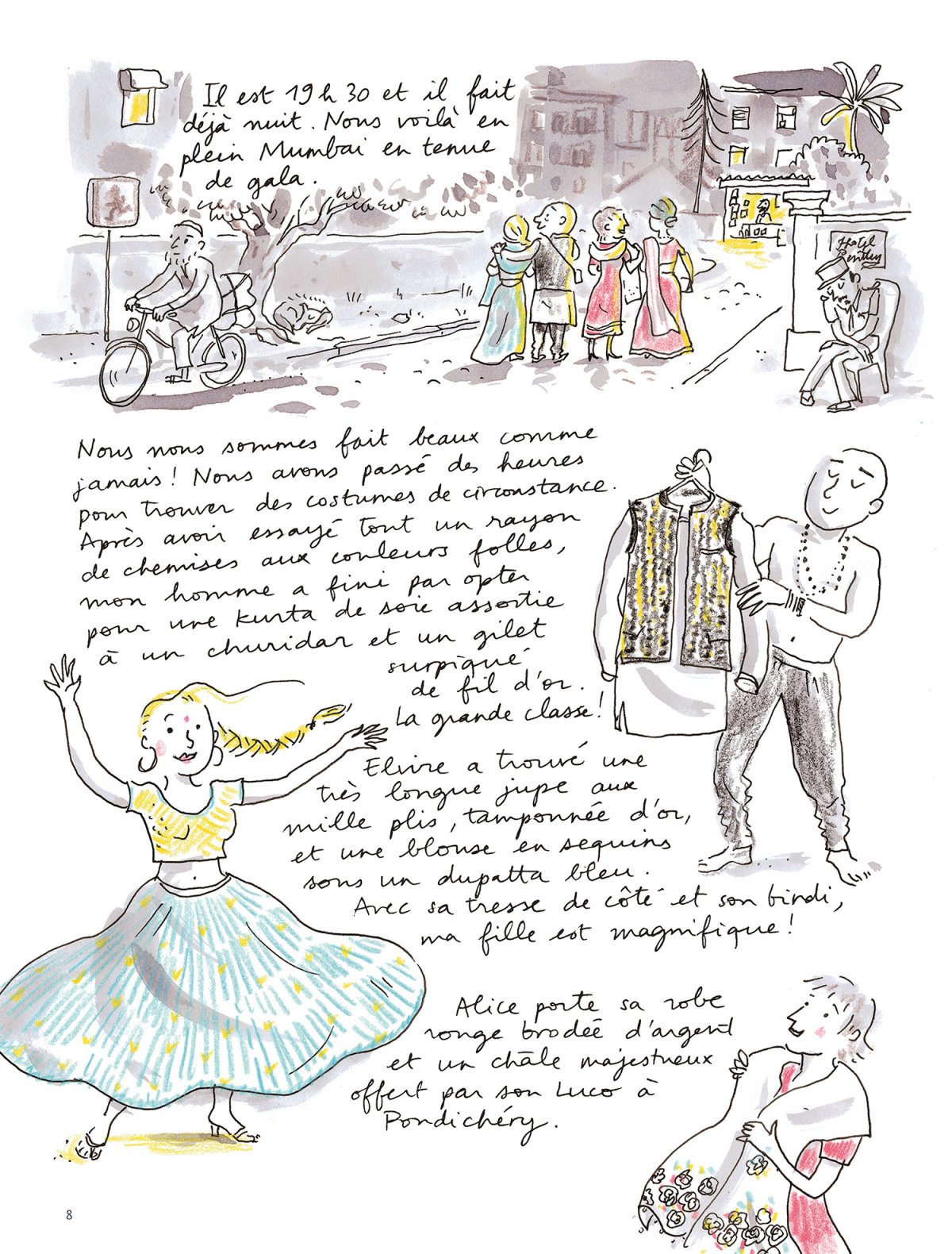Mumbai. 2017 . Alice, Sophie et sa famille se préparent pour aller assister à un mariage. Lorsqu’une invitée demande à Sophie dans quelles circonstances elle a connu Rita, la mère du marié, elle fait appel à ses souvenirs. Rita est plus jeune, elle se débat dans l’eau. Le père de Sophie plonge pour la sauver... Le récit lumineux d’une métamorphose, de comment on décide de transmettre une certaine résilience aux générations suivantes, de transformer un drame en joli conte et de jeter enfin le costume de victime.