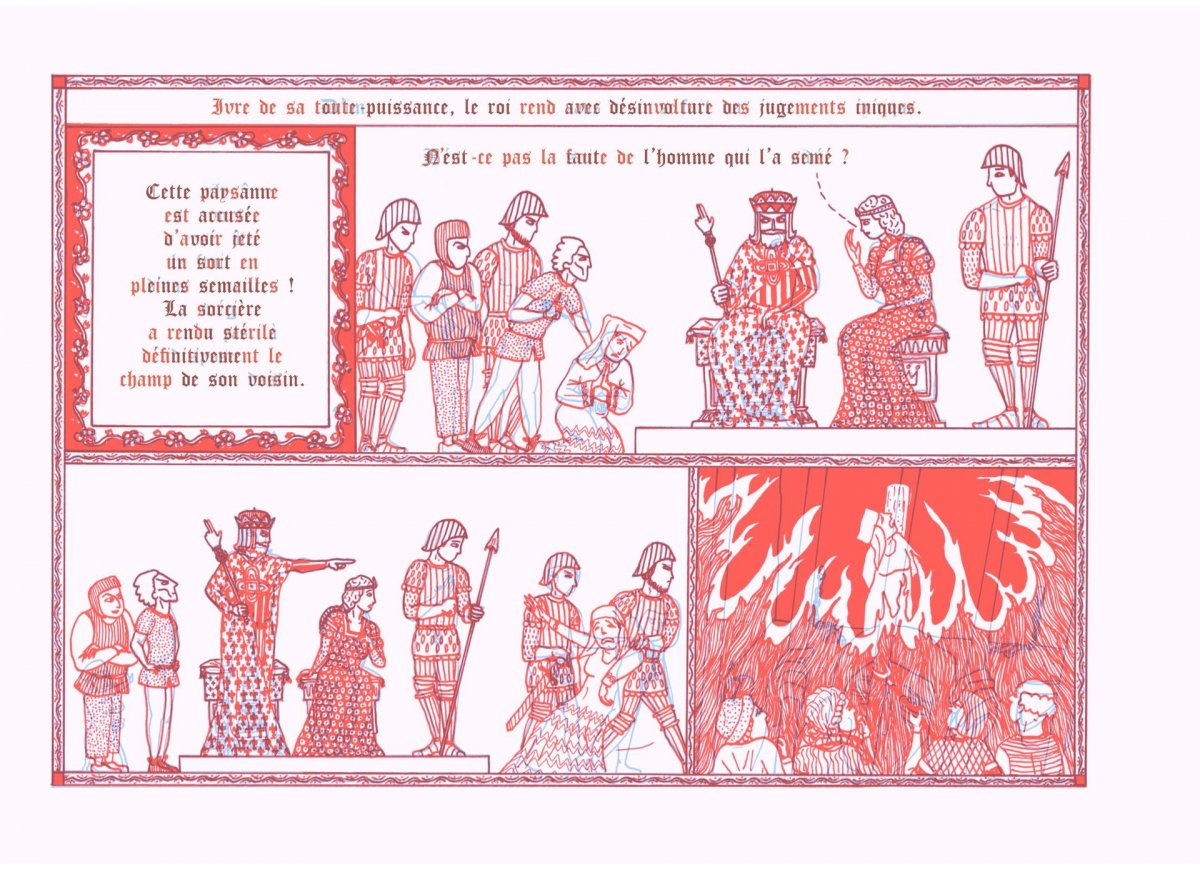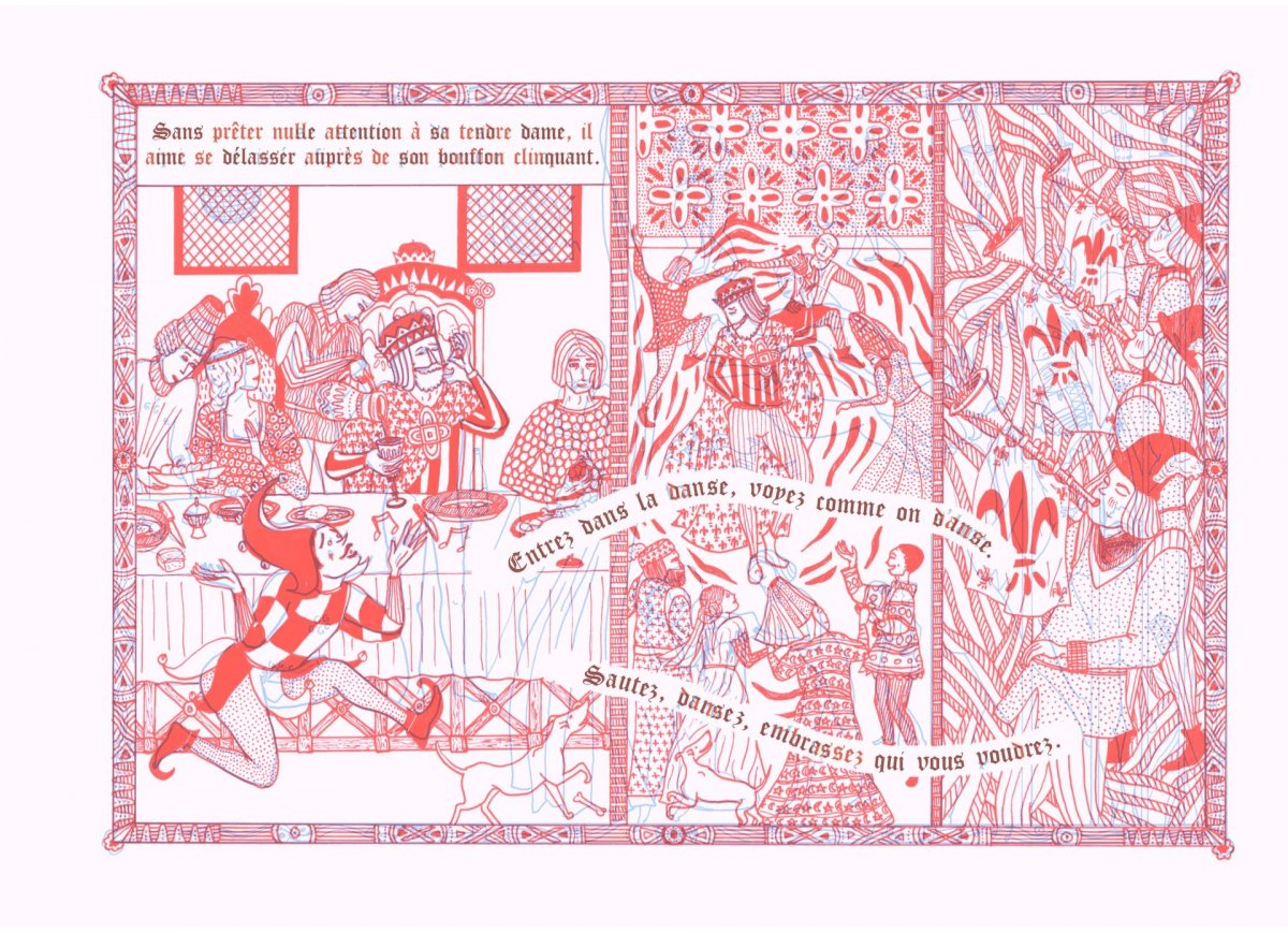 Au royaume de Mont-Tournure, le roi Jéhan de Potiguigni, imbus de son pouvoir, tire à la courte paille chacun de ses jugements. Méprisé par son peuple, sourd aux conseils de sa reine, il part en guerre pour faire taire la colère populaire. A moins que ce ne soit pour fuir son plus grand secret. Car... (Attention double-lecture. à l’aide d’un filtre rouge, le récit se modernise et met les corps et les complexes à nu.)... au royaume de Mont-Tounu, où l’on vit dévêtu, le roi Jéhan de Petitquiqui pense son sexe si petit que tout le monde en rit
