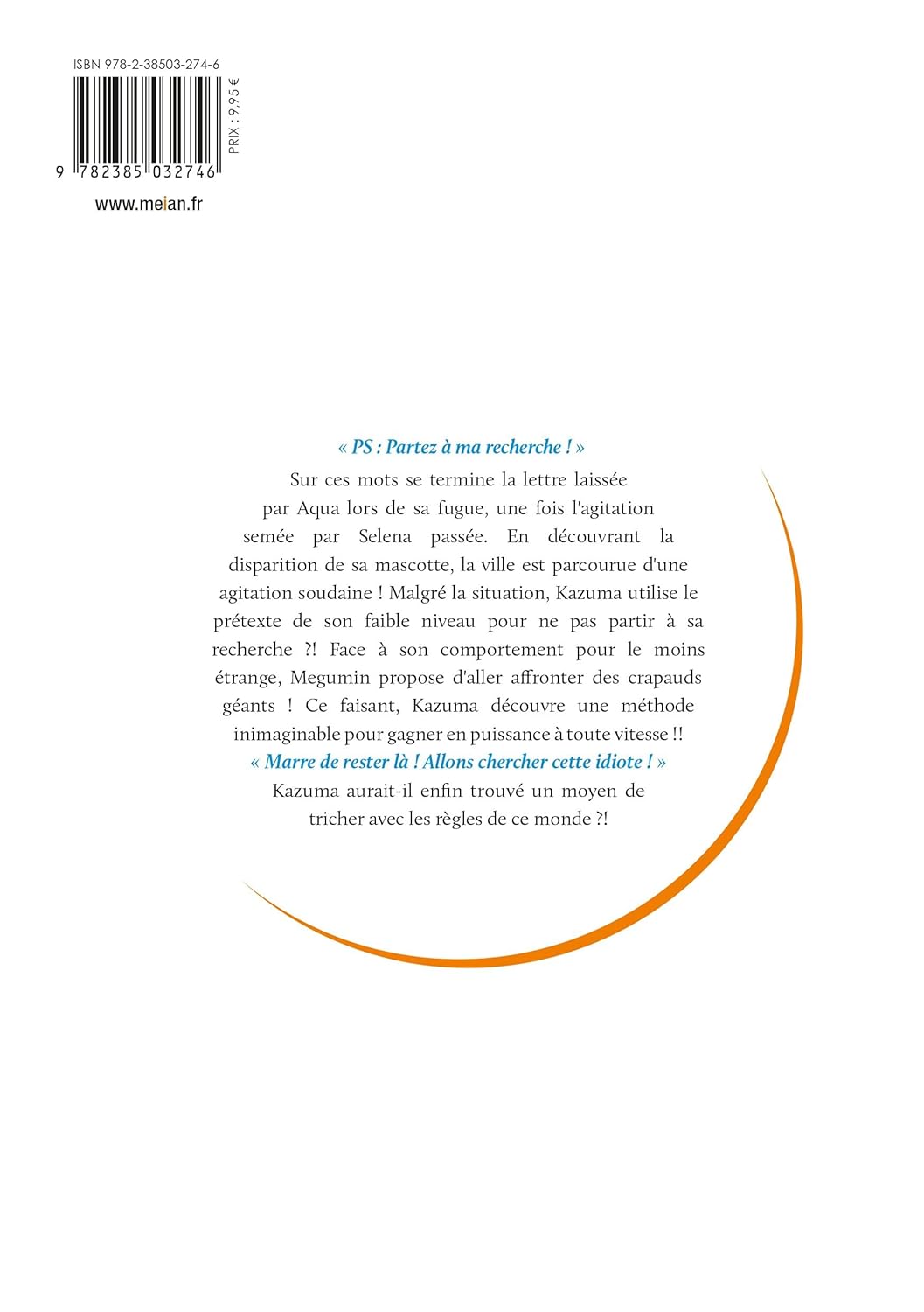 Sur ces mots se termine la lettre laissée par Aqua lors de sa fugue, une fois l’agitation semée par Selena passée. En découvrant la disparition de sa mascotte, la ville est parcourue d’une agitation soudaine ! Malgré la situation, Kazuma utilise le prétexte de son faible niveau pour ne pas partir à sa recherche ?! Face à son comportement pour le moins étrange, Megumin propose d’aller affronter des crapauds géants ! Ce faisant, Kazuma découvre une méthode inimaginable pour gagner en puissance à toute vitesse !!