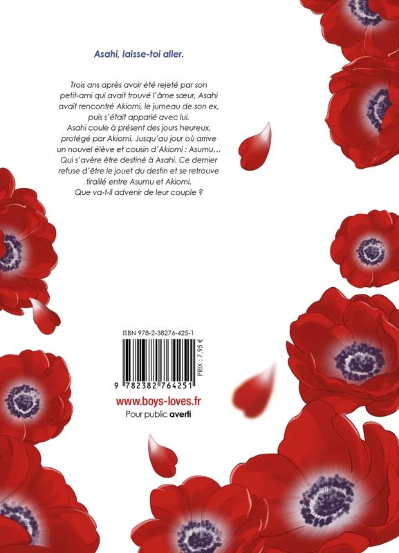 Trois ans après avoir été rejeté par son petit-ami qui avait trouvé l’âme soeur, Asahi avait rencontré Akiomi, le jumeau de son ex, puis s’était apparié avec lui. Asahi coule à présent des jours heureux, protégé par Akiomi. Jusqu’au jour où arrive un nouvel élève et cousin d’Akiomi : Asamu... qui prétend être destiné à Asahi. Ce dernier refuse d’être le jouet du destin et se retrouve tiraillé entre Asumu et Akiomi. Que va-t-il advenir de leur couple ?