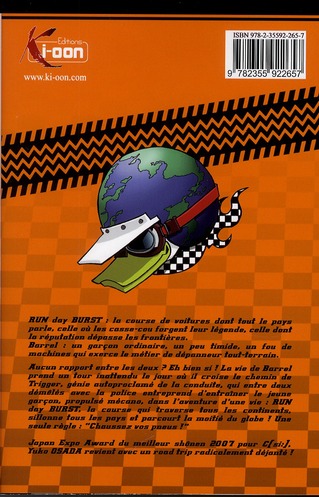 Run day Burst : la course de voitures dont tout le pays parle, celle où les casse-cou forgent leur légende, celle dont la réputation dépasse les frontières. Barrel : un garçon ordinaire, un peu timide, un fou de machines qui exerce le métier de dépanneur tout-terrain. Aucun rapport entre les deux ? Eh bien si ! La vie de Barrel prend un tour inattendu le jour où il croise le chemin de Trigger, génie autoproclamé de la conduite, qui entre deux démêlés avec la police entreprend d’entraîner le jeune garçon, propulsé mécano, dans l’aventure d’une vie : Run day Burst, la course qui traverse tous les continents, sillonne tous les pays et parcourt la moitié du globe ! Une seule règle : Chaussez vos pneus !