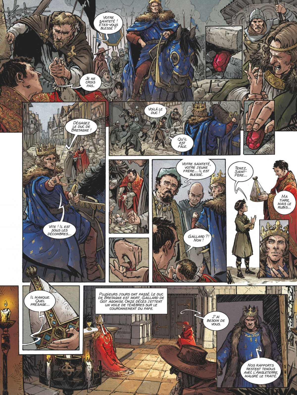 Lyon, 15 novembre 1305. Philippe le Bel, le puissant souverain, assiste au couronnement de Bertrand de Got devenant ainsi le pape Clément V. A la sortie de l’abbatiale Saint Juste, le nouveau pape, ému, est acclamé par les lyonnais. Il est le dixième pape français de l’histoire. Une foule immense et joyeuse s’est rassemblé sur le chemin du cortège qui traverse la ville. Mais soudain, un immense mur s’effondre sous le poids et l’agitation des gens venus voir le nouveau pape ! C’est la catastrophe, les corps inanimés s’entremêlent dans les gravats, la poussière et la décombres. Le roi est sauf mais le cheval du pape, en se cabrant, fait basculer celui-ci qui n’est finalement que blessé ! Onze personnes décèderont des suites de cet accident, parmi lesquels le duc de Bretagne et le jeune frère du pape