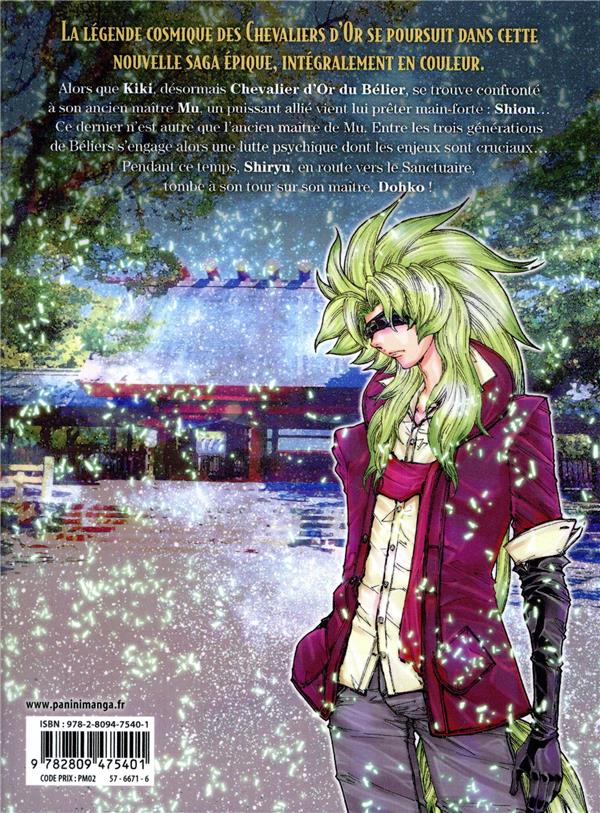 Kiki, le nouveau Chevalier d’Or du Bélier, doit combattre son ancien maître Mu et Shion se joint à la bataille ! Ce ne sont donc pas deux mais trois générations de Béliers qui s’affrontent. La lutte promet d’être aussi éthérée que brutale... car l’enjeu est immense. Pendant ce temps, Shiryu fait route vers le Sanctuaire. En chemin, il tombe sur son vénéré maître, Dohko...