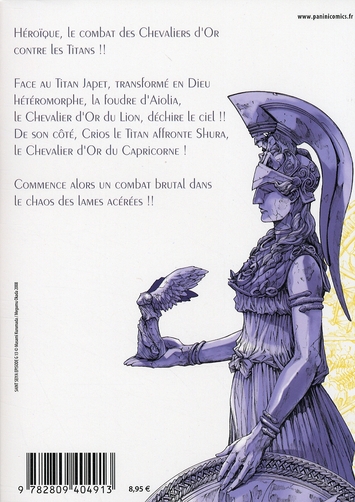 Héroïque, le combat des chevaliers d’Or contre les Titans ! ! Face au titan Japet, transformé en dieu hétéromorphe, la foudre d’Aiolia, le chevalier d’or du lion, déchire le ciel ! ! De son côté, Crios le titan affronte Shura, le chevalier d’Or du capricorne ! Commence alors un combat brutal dans le chaos des lames acérées ! !