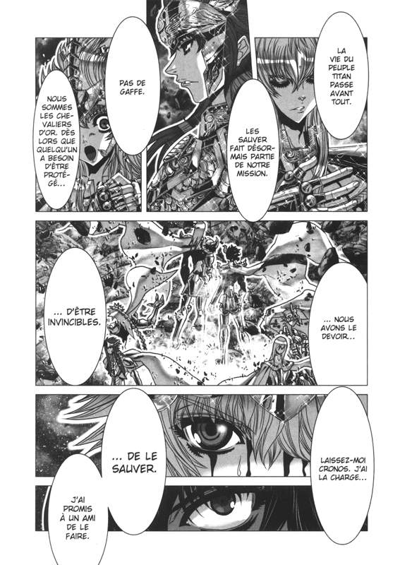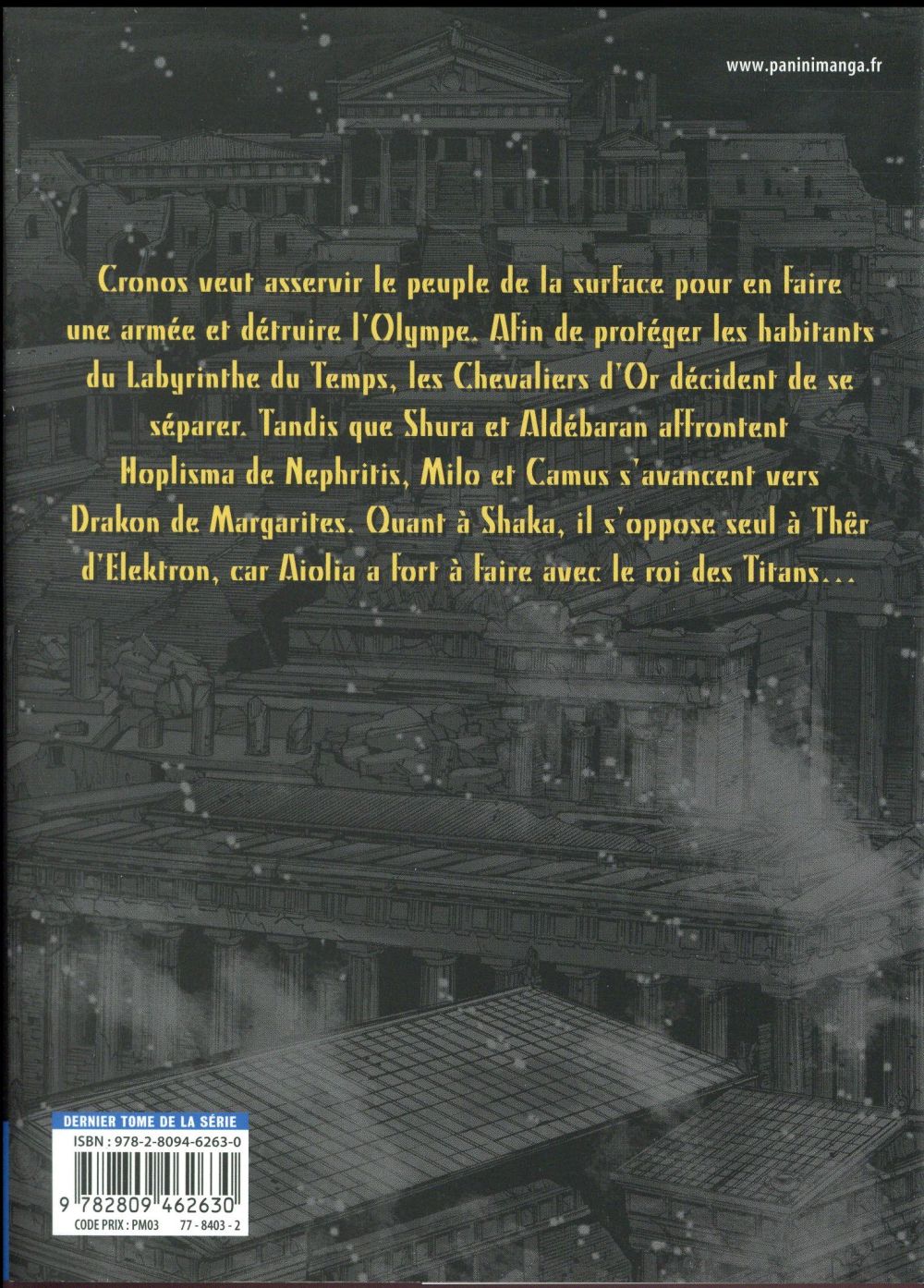 Cronos, veut asservir le peuple de la surface pour en faire une armée et ainsi détruire l’Olympe. Afin de protéger les habitants du Chronos Labyrinthos, les Chevaliers d’or décident de se séparer en trois groupes de deux. Tandis que Shura et Aldébaran affrontent Nephritis Hoplisma, Milo et Camus s’avancent vers Margarites Drakon. Shaka s’oppose seul à Elektron Thêr, car Aiolia à fort à faire avec le Roi des Titans...