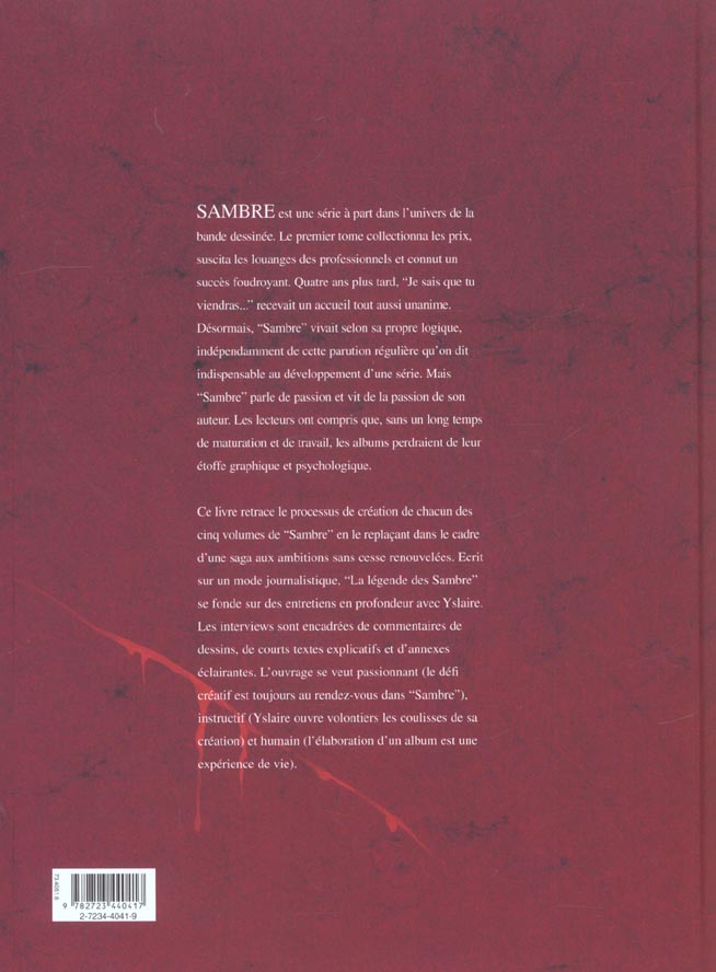 La Légende des Sambre explore, au prix de nombreuses révélations, les secrets de fabrication de chaque album. Yslaire a extrait de ses archives de fascinants documents (crayonnés, recherches de personnages, photos de repérage...). Tout au long d’entretiens passionnants, Yslaire est poussé dans ses derniers retranchements, jusqu’à ces zones où se mêlent intimement le créateur et sa création. Dans un style journalistique vivant (exit l’exégèse pontifiante), sont abordés de multiples sujets : le romantisme, la révolution en parallèle aux sentiments des personnages, la logique des titres, le long cheminement vers le dessin définitif, la collaboration avec Balac, le rôle croissant de Julie, les couleurs exceptionnelles de la série... Ces thèmes sont abordés comme autant d’articles indépendants, afin de permettre une lecture « au choix ». Textes et images se renforcent pour permettre au lecteur d’en savoir (presque) autant sur Sambre que Yslaire.