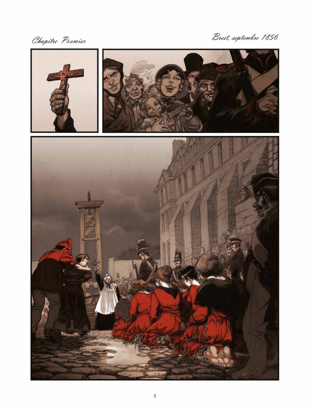 Le cinquième album sera donc l’événement BD de cette fin d’année. Il ouvre une nouvelle période dans la saga. Bernard Sambre est mort sur les barricades, sans avoir accompli son rêve d’amour impossible.Julie, devenue au fil des albums le personnage central de la série, a été expédiée dans un bagne en Algérie. L’enfant de Bernard lui a été enlevé. Son éducation a été confiée à Sarah, la soeur folle qui vit dans le souvenir de son père et de son frère. Nous retrouvons les personnages huit ans plus tard. Julie, via Brest, rejoint Cayenne avec une remise de peine à la clef. Bernard-Marie, le fils de Bernard et Julie, vit à la Bastide, une demeure qui ressemble de plus en plus au tombeau des Sambre. L’enfant va-t-il échapper au destin que lui construit Sarah ? Mère et fils vont-ils se retrouver ? Le désirent-ils seulement ? Qui sera le vainqueur du duel que se livrent à distance Julie et Sarah ? La Guerre des yeux va-t-elle renaître ? Plus que jamais Yslaire met en scène des personnages à la psychologie complexe et fascinante. Son dessin est transpercé par les frémissements de la vie. Prince de la ligne sombre, il perfectionne, grâce aux techniques modernes, une éblouissante mise en couleurs qui est pour beaucoup dans la magie des albums Sambre.