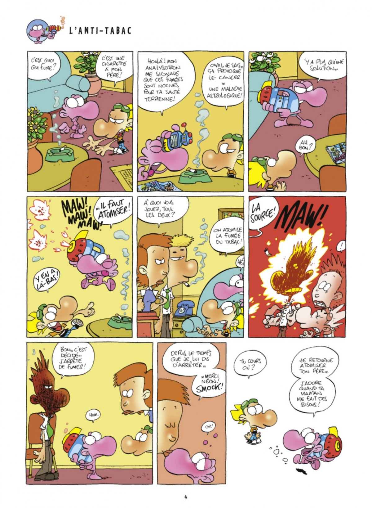 Dès le début de ces nouvelles aventures de Samson & Néon, le petit extraterrsestre commence à faire des siennes. Il attrape le rhume de Pluton, une saleté de microbe qui transforme sa morve en ignoble monstre gluant. Il raconte aussi les origines de son cerveau, capable de sortir de son crâne, qu’il aurait rencontré par hasard en faisant du jogging sur la planète Gurwz. Ensuite Néon fait la manche auprès de Samson pour avoir 1 euro, puis ils vont se balader en campagne. Néon se voit obligé de faire du bouche à bouche à Samson pour le sauver d’une noyade même s’il trouve ça dégoûtant, et pire encore, il goûte ensuite de la crotte de chien, avant d’expérimenter, non sans mal, le maillot de bain flotteur à la piscine.Et lorsqu’ils partent en balade sur la planète de Néon, ils tuent des monstres mutants à l’insecticide ou se croient dans un parc d’attractions... Vous l’avez compris, les aventures du petit extraterrestre et de son copain humain sont toujours aussi délirantes, pour le plus grand plaisir de leurs lecteurs !