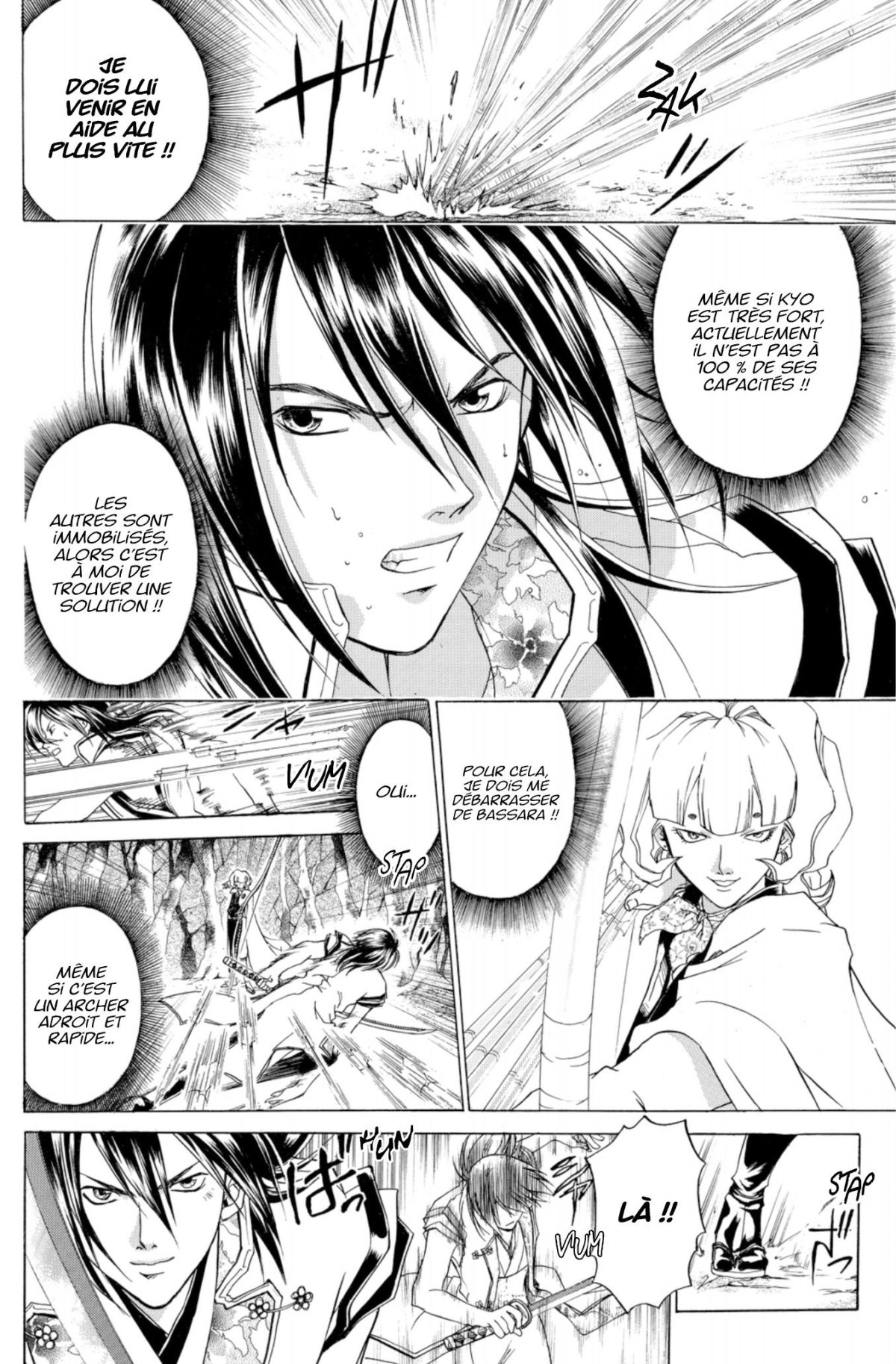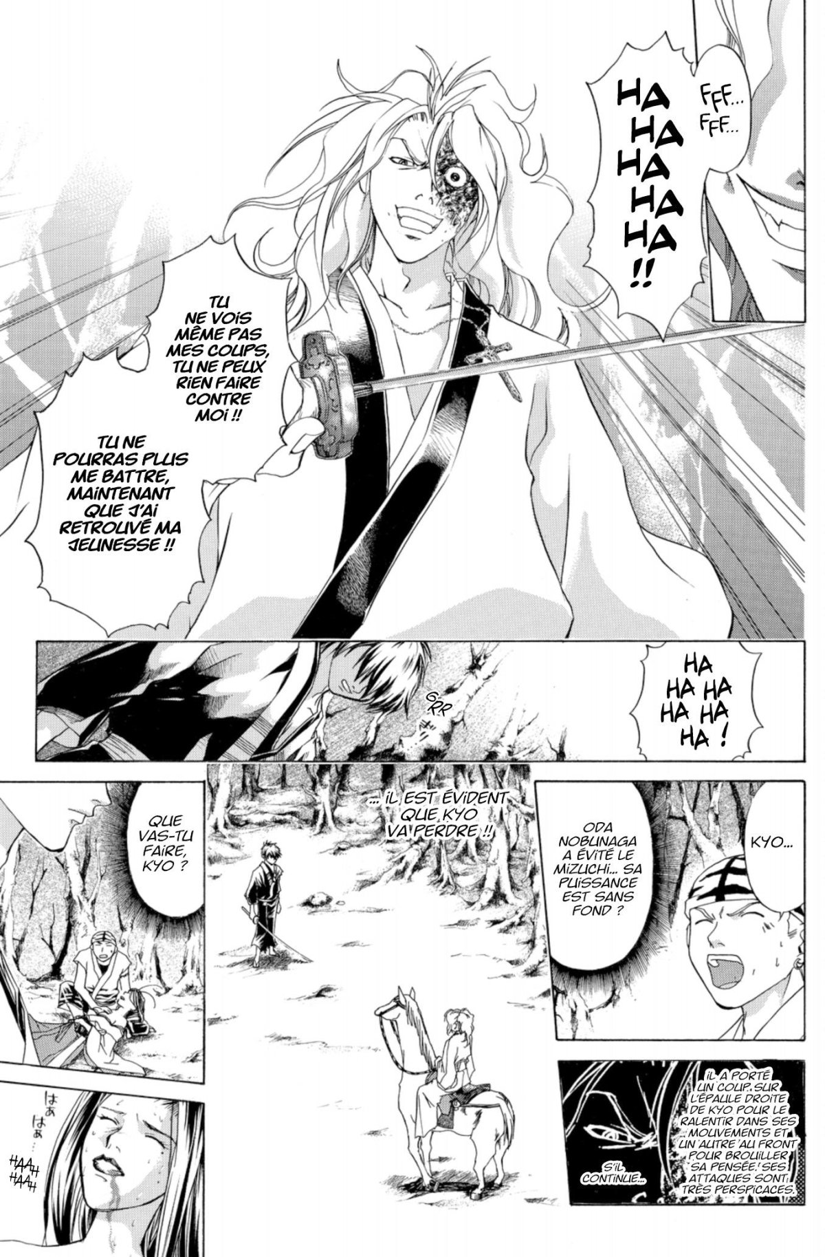 La technique du meurtre au sabre dite du vent divin obscur, Mizuchi, ne fonctionne pas sur Nobunaga Oda, qui a ressuscité dans un nouveau corps. En revanche, Kyo est grièvement blessé par la main du diable de Nobunaga. Afin de secourir Kyo, qui est gravement touché, Tigre Rouge décide de participer au combat. De leur côté, Yukimura et Sasuke affrontent Bassara et Santera des 12 Généraux Célestes. Tigre rouge ne parvient pas à prendre le dessus sur Nobunaga, tant celui-ci possède une puissance écrasante. C’est là qu’un changement opère dans le corps de Kyo qui a dépassé son temps limite pendant lequel il peut combattre. Après un hurlement soudain, c’est Kyoshiro Mibu qui fait son apparition devant Nobunaga !