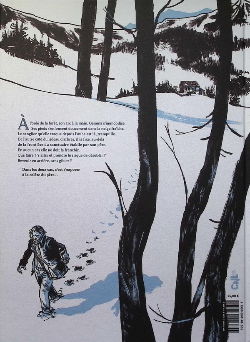 À l’orée de la forêt, son arc à la main, Gemma s’immobilise. Ses pieds s’enfoncent doucement dans la neige fraîche. Le sanglier qu’elle traque depuis l’aube est là, tranquille. De l’autre côté du rideau d’arbres, il la fixe, au-delà de la frontière du sanctuaire établie par son père. En aucun cas elle ne doit la franchir. Que faire ? Y aller et prendre le risque de désobéir ? Revenir en arrière, sans gibier ? Dans les deux cas, c’est s’exposer à la colère du père ...