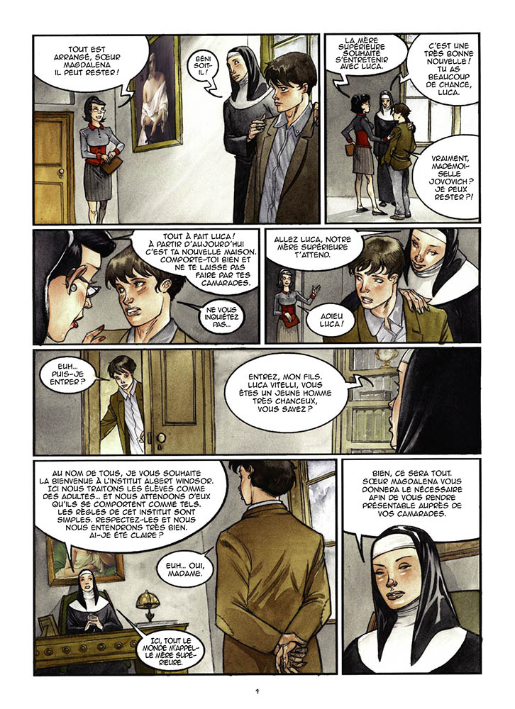 L’Institut Albert Windsor est une école pour gosses de riches. Une école élitiste dans laquelle chaque événement est sujet à cancans. Un jour une assistante sociale se présente au bureau de l’Institut pour y faire admettre un de ses protégés. Que peut bien vouloir une simple employée d’orphelinat dans un tel établissement ? Pour simple réponse elle tend une lettre à la relieuse qui tient cette honorable école d’une main de fer. Sans autre explication, la mère supérieure admet aussitôt le jeune Luca Vitelli au sein de l’école malgré le coût prohibitif des frais scolaires. Que cache cette admission discrète ? Le début une longue série de scandales qui en 48 pages, tient en haleine le lecteur jusqu’à son déroulement final.