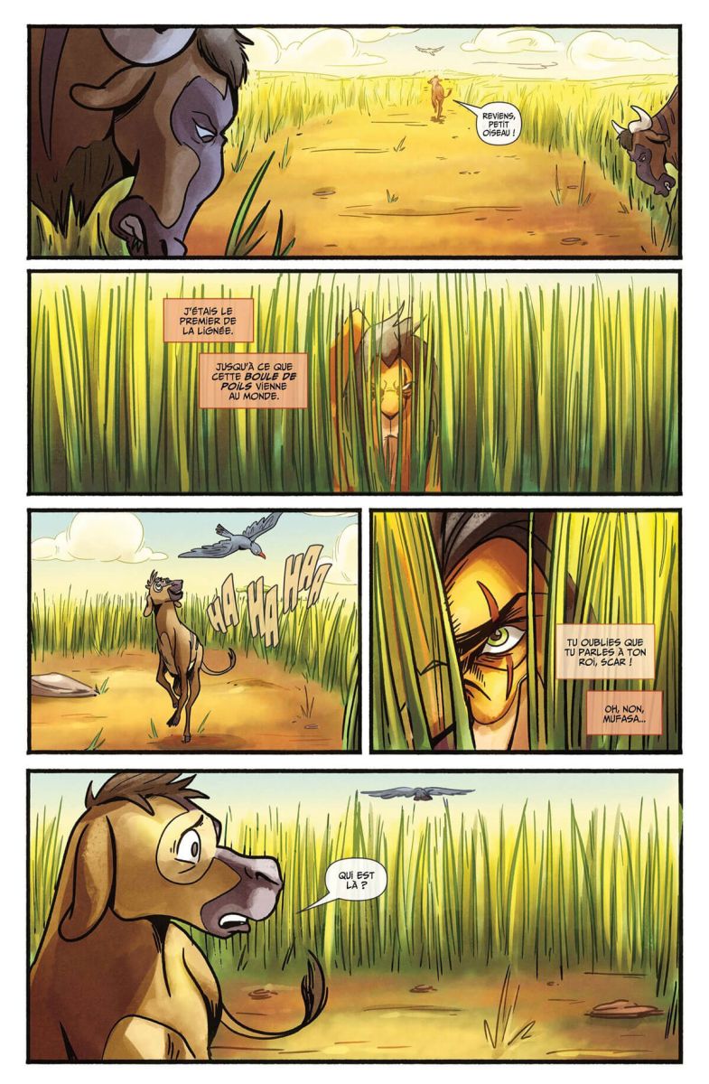 Au-delà de la genèse du plan de Scar pour se débarrasser de Simba, ce récit nous offre aussi un regard inédit sur l’univers du Roi Lion : on y découvre des interactions inattendues entre des personnages qui ne s’étaient jamais croisés dans les films ou les dessins animés.
