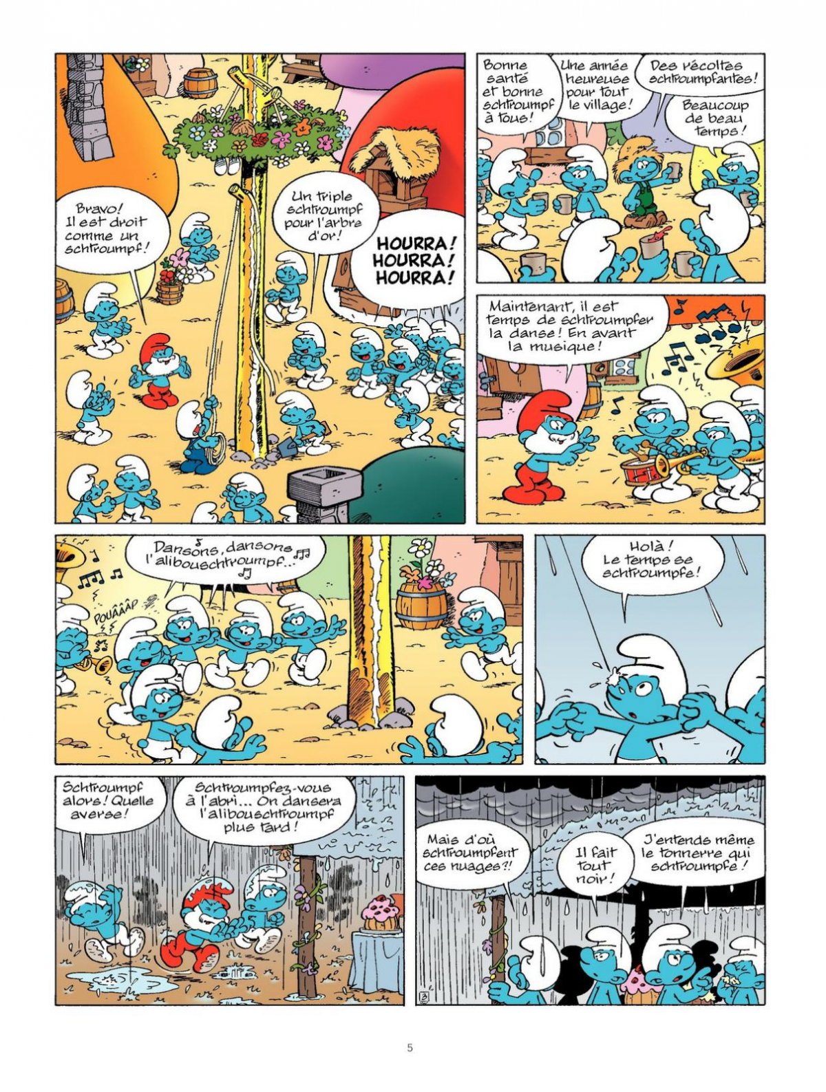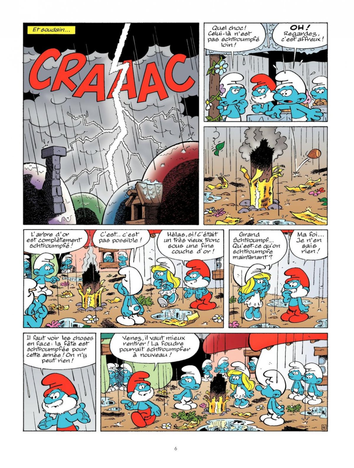 Une nouvelle année démarre chez les Schtroumpfs autour de la traditionnelle fête de l’Arbre d’Or. Mais, la foudre vient réduire le précieux totem en cendres et, à en croire le Schtroumpf Peureux, ce mauvais présage annonce une année de malheur ! La superstition s’empare bien vite du village et chacun y va de son gri-gri, du rituel ancestral et autres prédictions astrales. Le Grand Schtroumpf va devoir trouver un moyen d’inverser la tendance... Décidément, les lutins de Peyo sont schtroumpfement humains, lorsqu’ils s’y mettent !