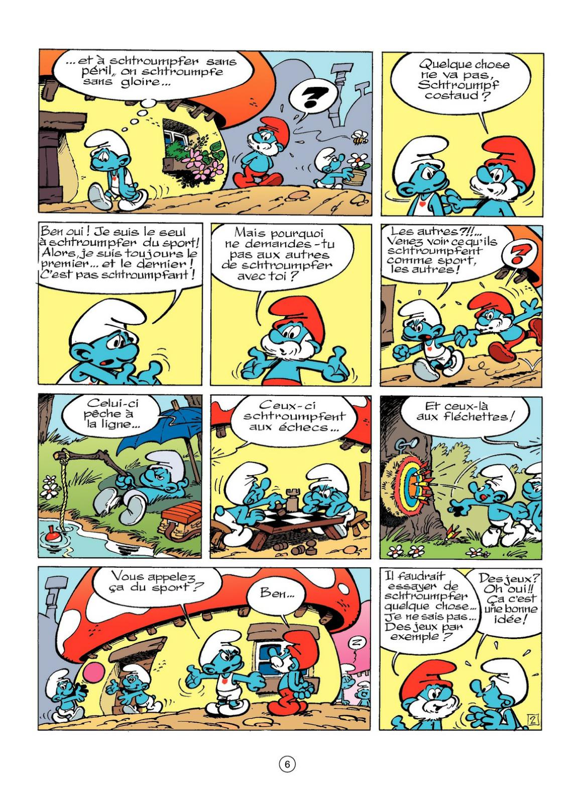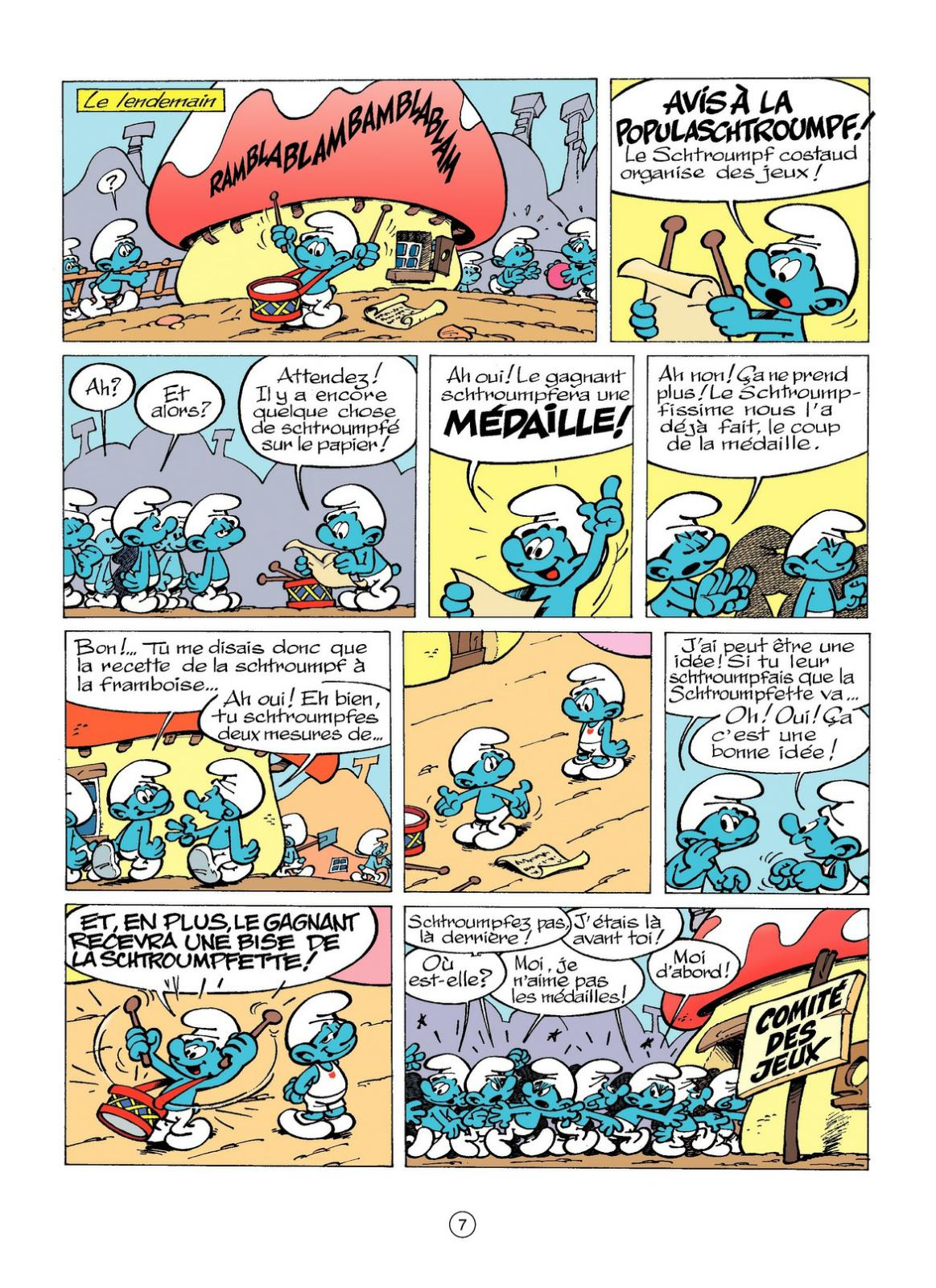 L’entraînement commence le lendemain, sous la supervision du Schtroumpf Costaud et du Schtroumpf à Lunettes, autoproclamé arbitre des jeux. Au programme des jeux : course de relais, lancer du javelot, natation, lutte, etc. et enfin le difficile marathon. Le Schtroumpf Chétif, aidé du Grand Schtroumpf qui lui fait croire que la confiture de framboise est un dopant, va remporter la plupart des épreuves, et s’imposer devant les autres équipes.